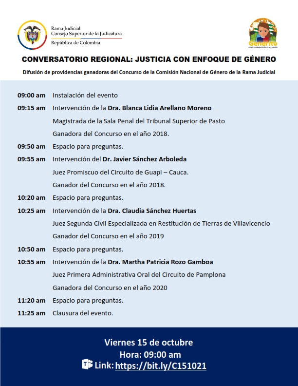 El Comité Seccional de Género de Caquetá invita a todas/os las/los servidores judiciales y público en general, a participar de la actividad académica que se realizará el próximo viernes 15 de octubre a las 9:00 a.m.