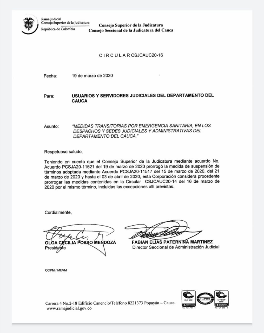CIRCULAR CSJCAUC20-16 del 19 de marzo de 2020: "MEDIDAS TRANSITORIAS POR EMERGENCIA SANITARIA EN LOS DESPACHOS Y SEDES JUDICIALES Y ADMINISTRATIVAS DEL DEPARTAMENTO DEL CAUCA"