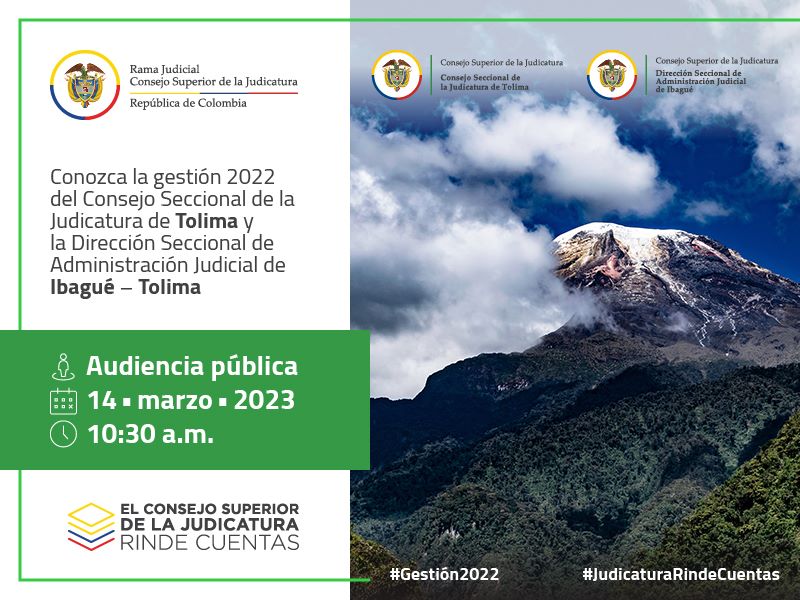 El Consejo Seccional de la Judicatura del Tolima y la Dirección Seccional de Administración Judicial de Ibagué invitan a la ciudadanía e interesados a pariticipar en la audiencia pública de rendición de cuentas que se llevará a cabo el 29 de marzo de 2022, a partir de las 10:00 a.m.