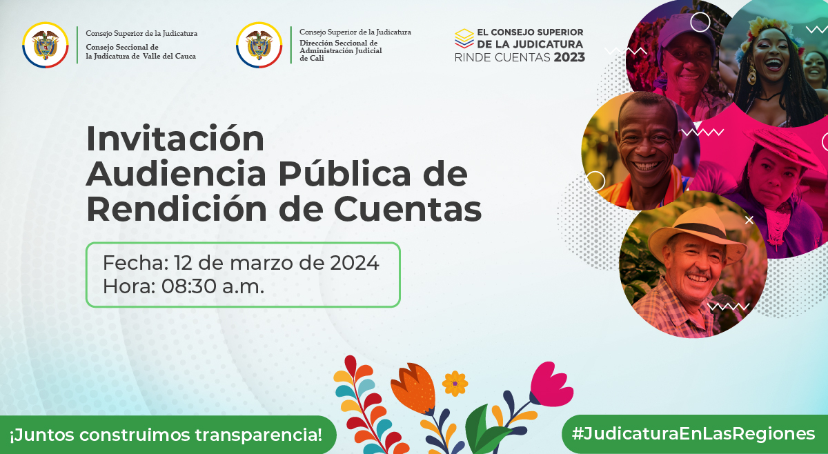 El Consejo Seccional de la Judicatura del Valle del Cauca y la Dirección Seccional de Administración Judicial de Cali, invitan a la ciudadanía e interesados a participar en la audiencia pública de rendición de cuentas que se realizará el jueves 16 de marzo de 2023 a partir de las 8:30 a.m.