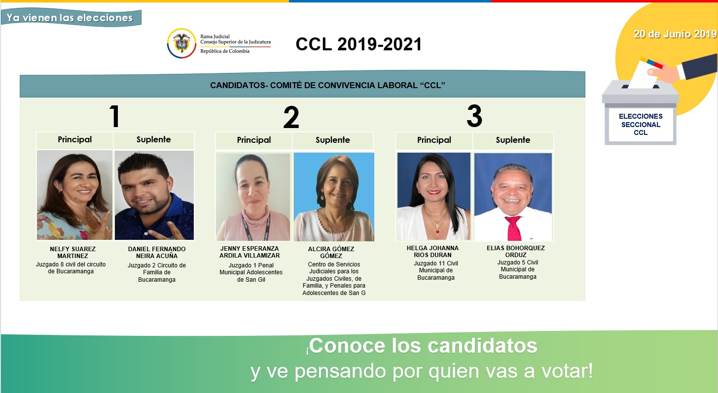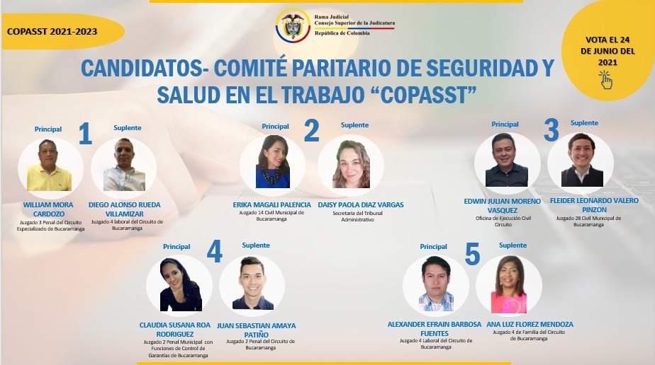 De conformidad con lo establecido en la Política de Seguridad y Salud en el Trabajo de la Rama Judicial, y en cumplimiento de la normatividad vigente en la materia, se convoca a todos los funcionarios y servidores judiciales de los Distritos Judiciales de Bucaramanga y San Gil adscritos a la Dirección Ejecutiva Seccional de Administración Judicial de Bucaramanga, para que mediante votación libre, directa y secreta, elijan a los representantes de los funcionarios y empleados con sus respectivos suplentes, ante el Comité de Convivencia Laboral- CCL y el Comité Paritario de Seguridad y Salud en el Trabajo -COPASST, en el período comprendido entre 2021 - 2023.