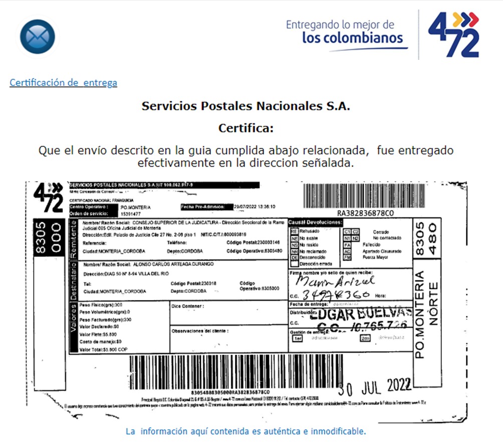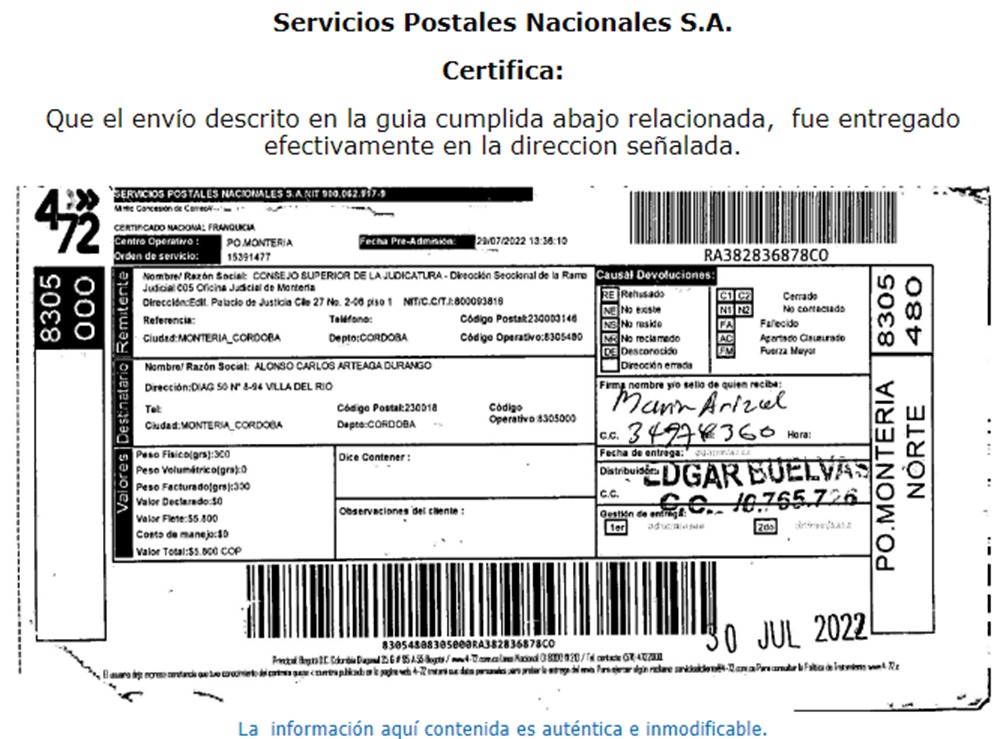 PUBLICACIÓN OFICIO DESAJMOO22-964 NOTIFICACIÓN POR AVISO DEL ACTA LIQUIDACIÓN SER005 DE 2020 ALONSO CARLOS ARTEAGA DURANDO