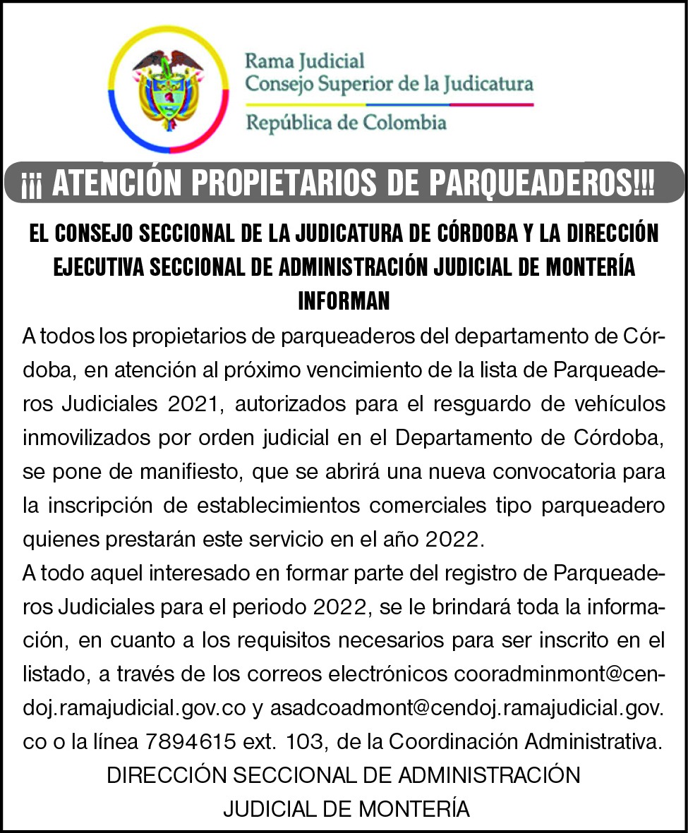 - RESOLUCION No. DESAJMOR22-1633 8 de noviembre de 2022 "POR MEDIO DE LA CUAL SE HACE CONVOCATORIA PÚBLICA PARA REALIZAR LA CONFORMACIÓN DEL REGISTRO DE PARQUEADEROS PARA EL AÑO 2023, AUTORIZADOS PARA CUSTODIAR LOS VEHÍCULOS INMOVILIZADOS POR ORDEN JUDICIAL EN EL DISTRITO JUDICIAL DE MONTERIA."