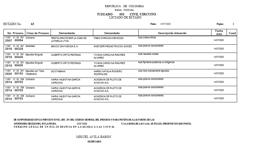 | 11001 31 03 001 2007 00094 | Ordinario | RESTAURANTE BAR LA CASA DE LA PAELLA LTDA. | FABIO MIRANDA MENDOZA VER |