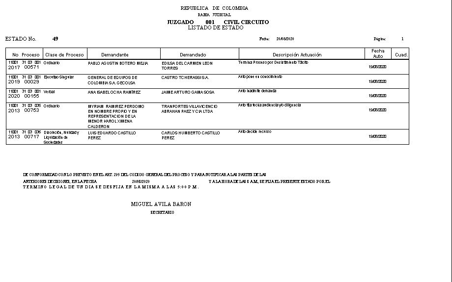 | 11001 31 03 001 2020 00206 | Ejecutivo Singular | LUIS ALFREDO BASTIDAS CARDENAS | EMPRESA MAXO S.A.S. VER | |