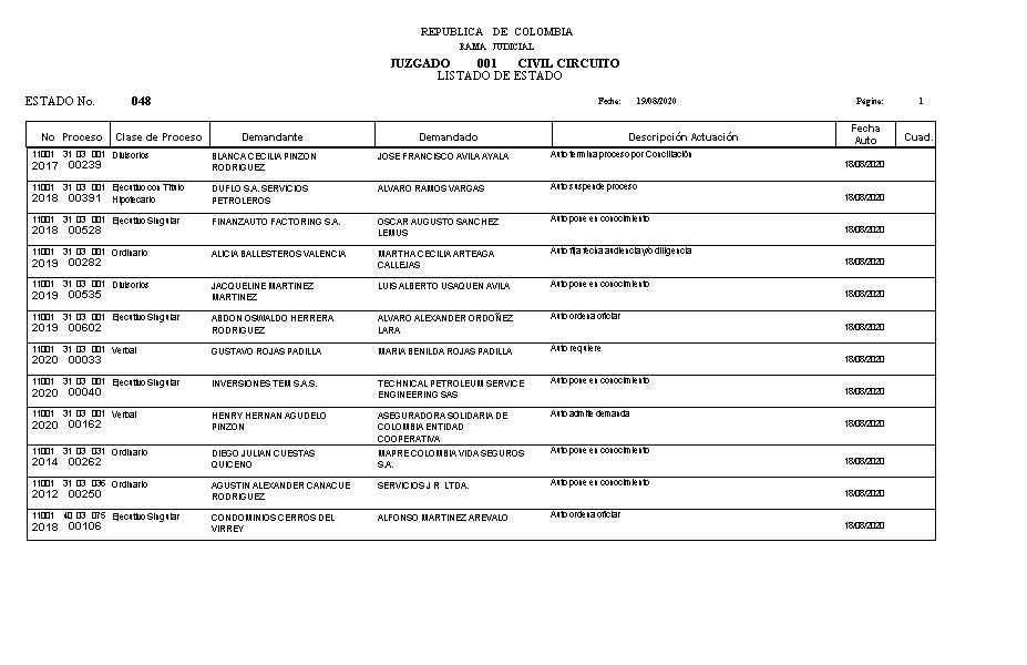 | 11001 31 03 001 2019 00234 | Ordinario | FIDUCIARIA COLPATRIA S.A. | RAUL RODRIGUEZ CARVAJAL VER |