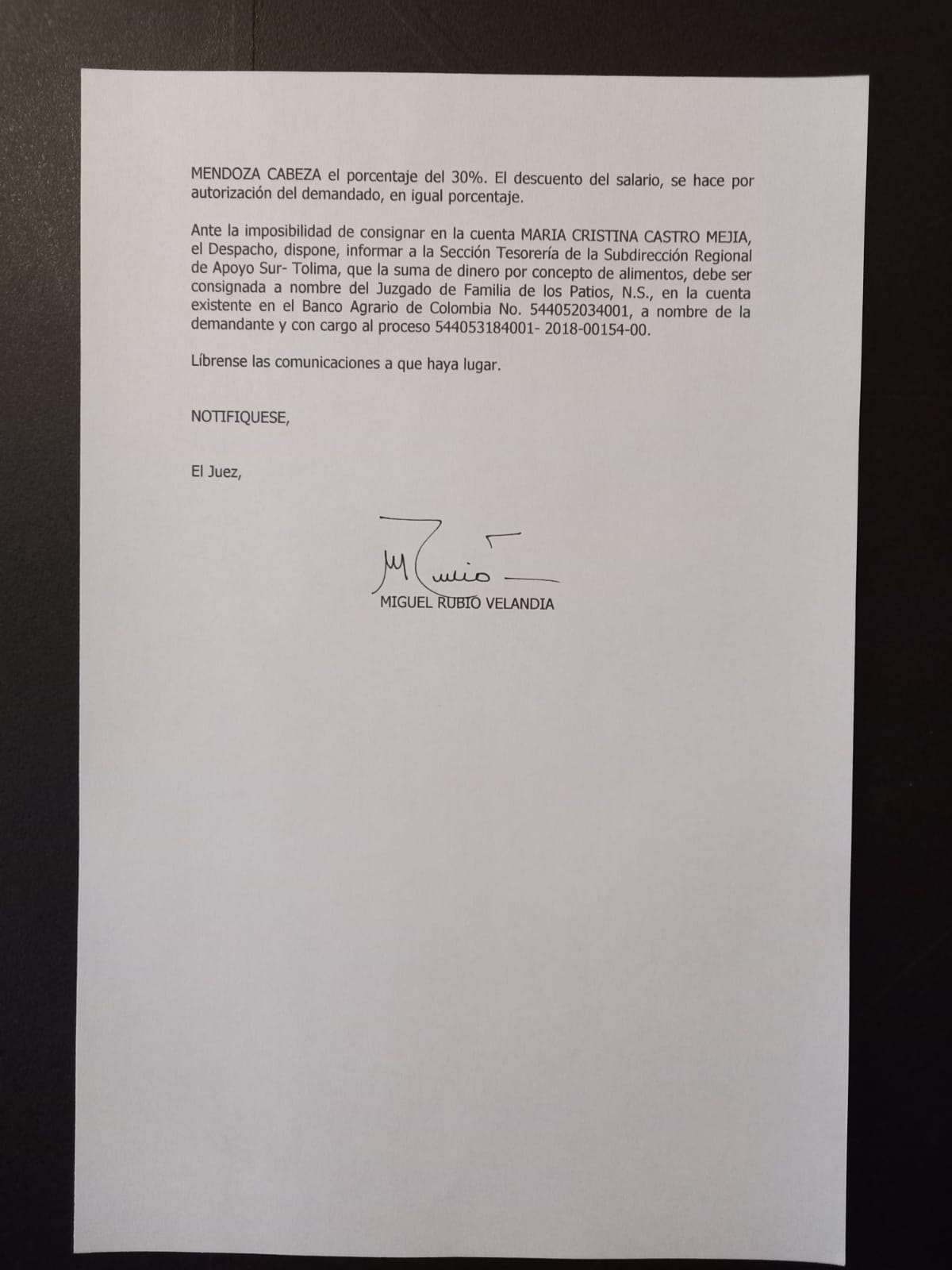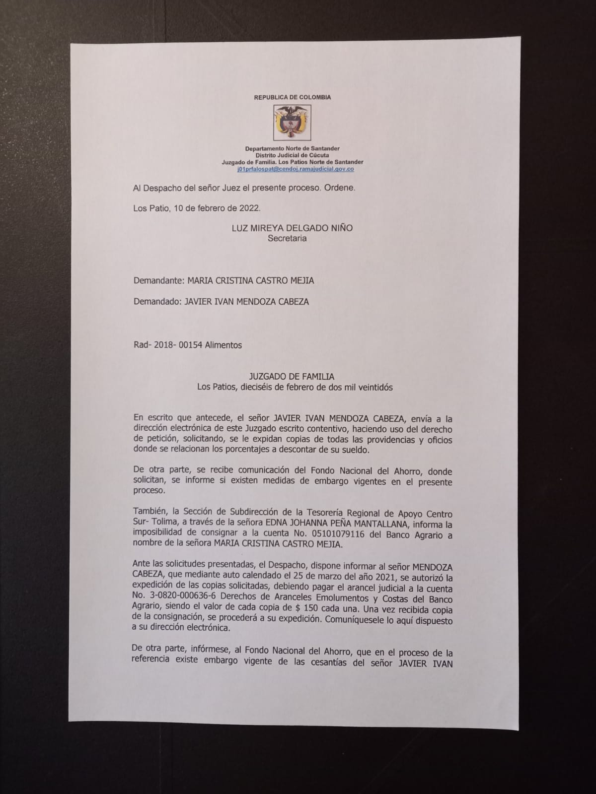 | 20/01/2022 | EJECUTIVO ALIMENTOS | NAYDU RAMIREZ | OMAR SUAREZ | VER | 2020-00234 |