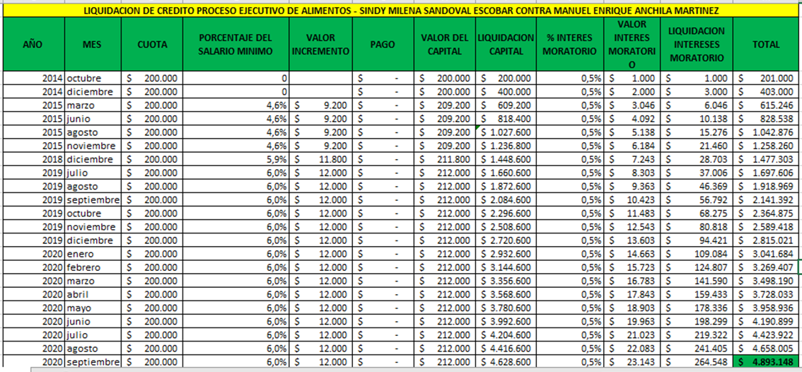 | 1 | 2020- 00080-00 | EJECUTIVO DE ALIMENTOS | SINDY MILENA SANDOBAL ESCOBAR | MANUEL ENRIQUE ANCHILAMARTINEZ | TRASLADO DE LIQUIDACION DE CREDITO |