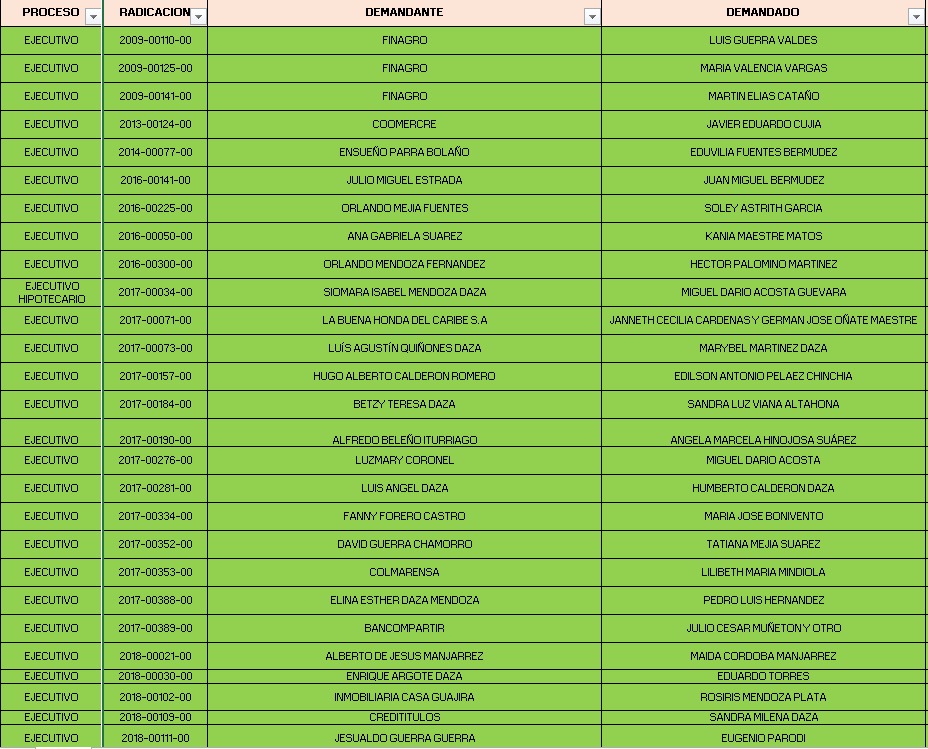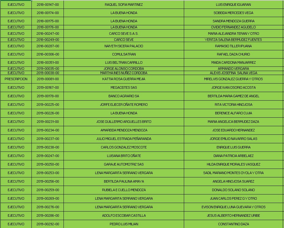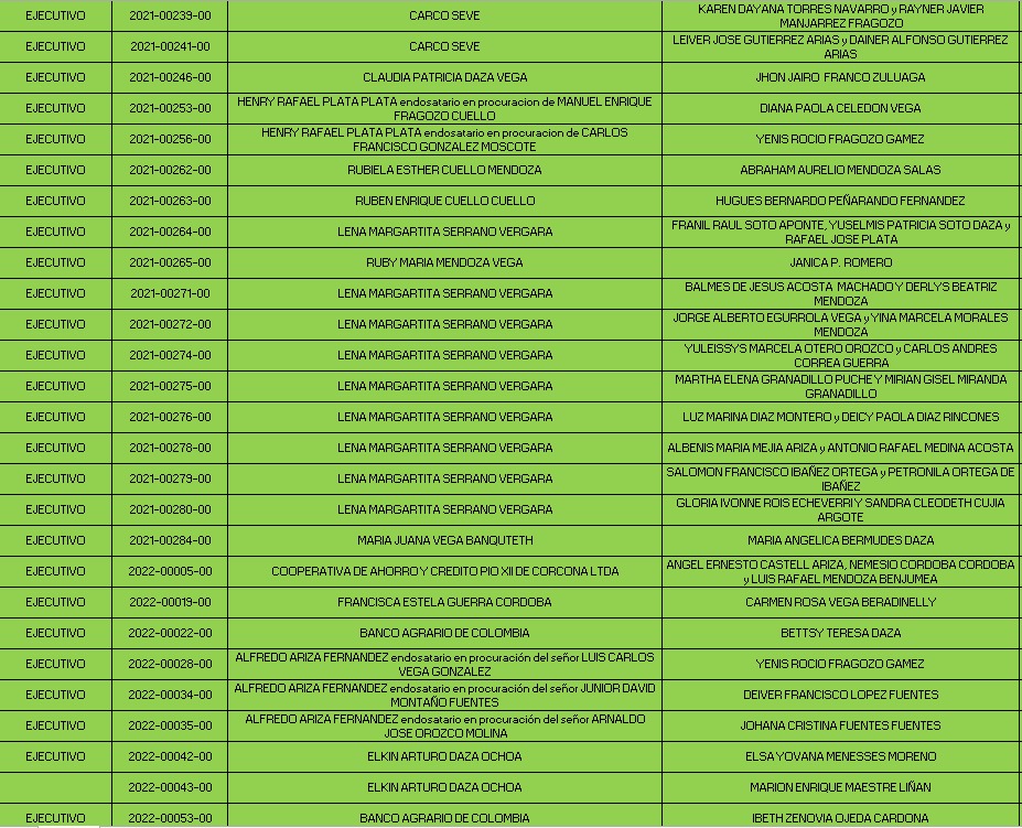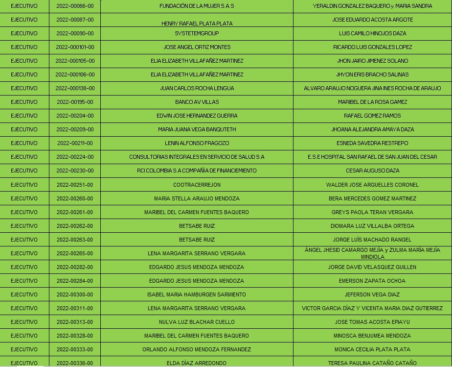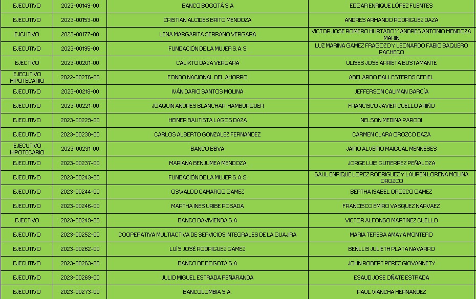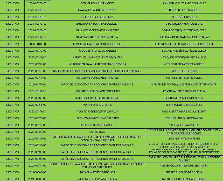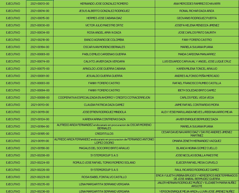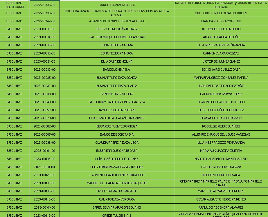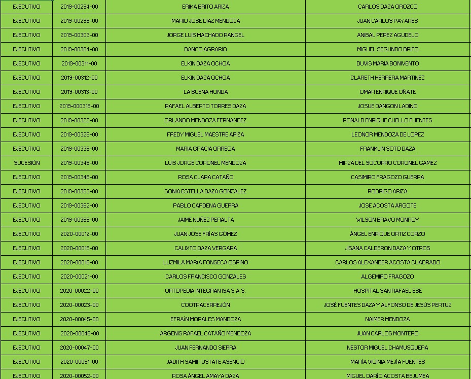 | 2021-00112-00 | ASODEGUA | ELVIS LUÍS CUJÍA ARIZA | REIVINDICATORIO | AUD. INICIAL (ART.392) | 25-ene-23 | 2:00 a.m | https://call.lifesizecloud.com/16866735 |