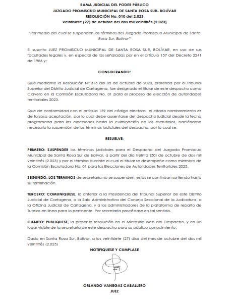 El Juzgado 001 Promiscuo Municipal de Santa Rosa del Sur, se permite informar que de conformidad con el plan de trabajo previsto al interior del despacho se hace necesario poner en conocimiento que la programación del pago de depósitos judiciales se realizará el segundo viernes de cada mes.
