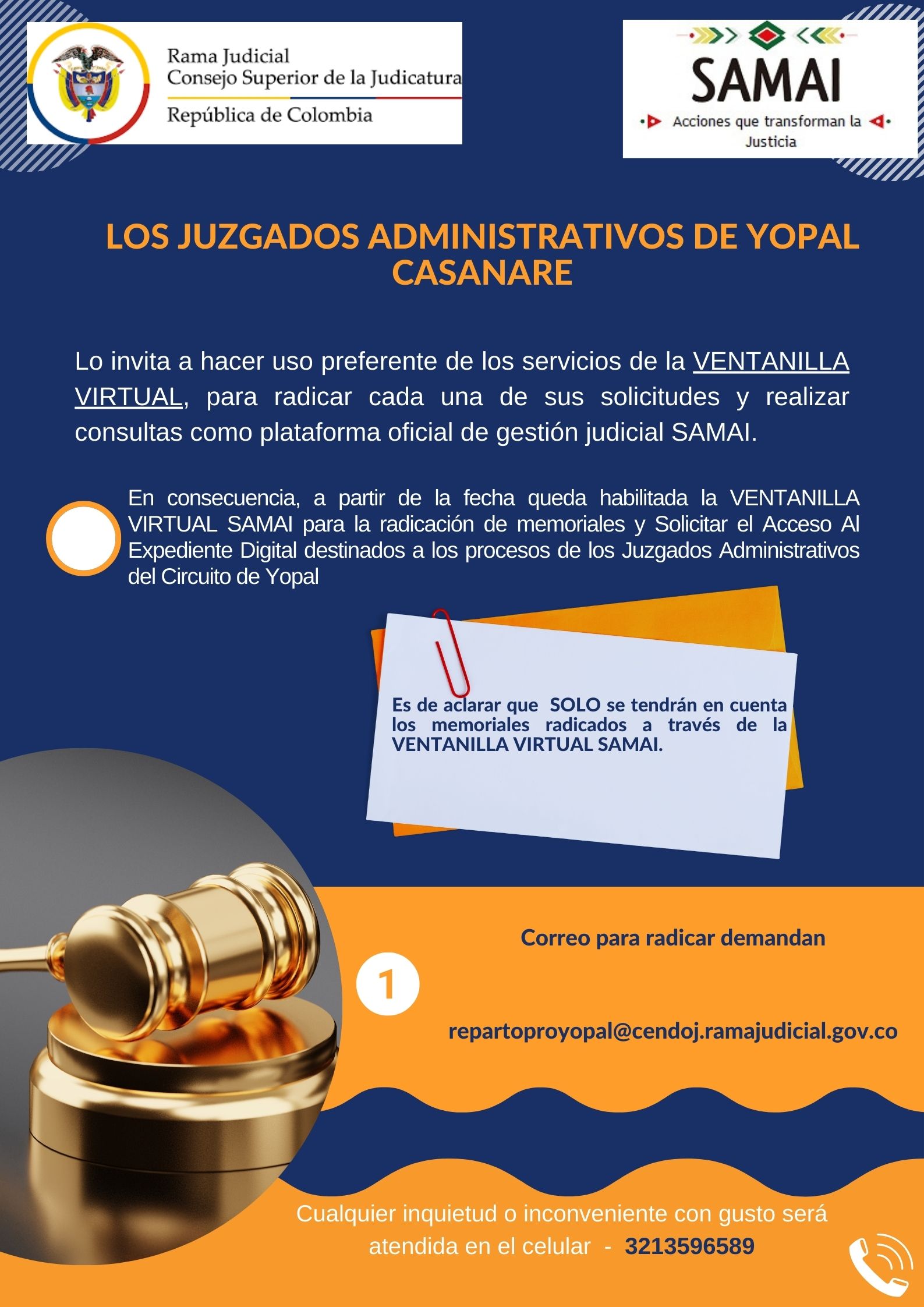Señores Usuarios, la recepción de los memoriales y demás solicitudes dirigidas al Juzgado 4° Administrativo de Yopal, se efectuará exclusivamente a través de la ventanilla virtual de la plataforma SAMAI. Lo anterior en cumplimiento del Acuerdo PCSJA23-12068 del 16 de mayo de 2023 del Consejo Superior de la Judicatura.