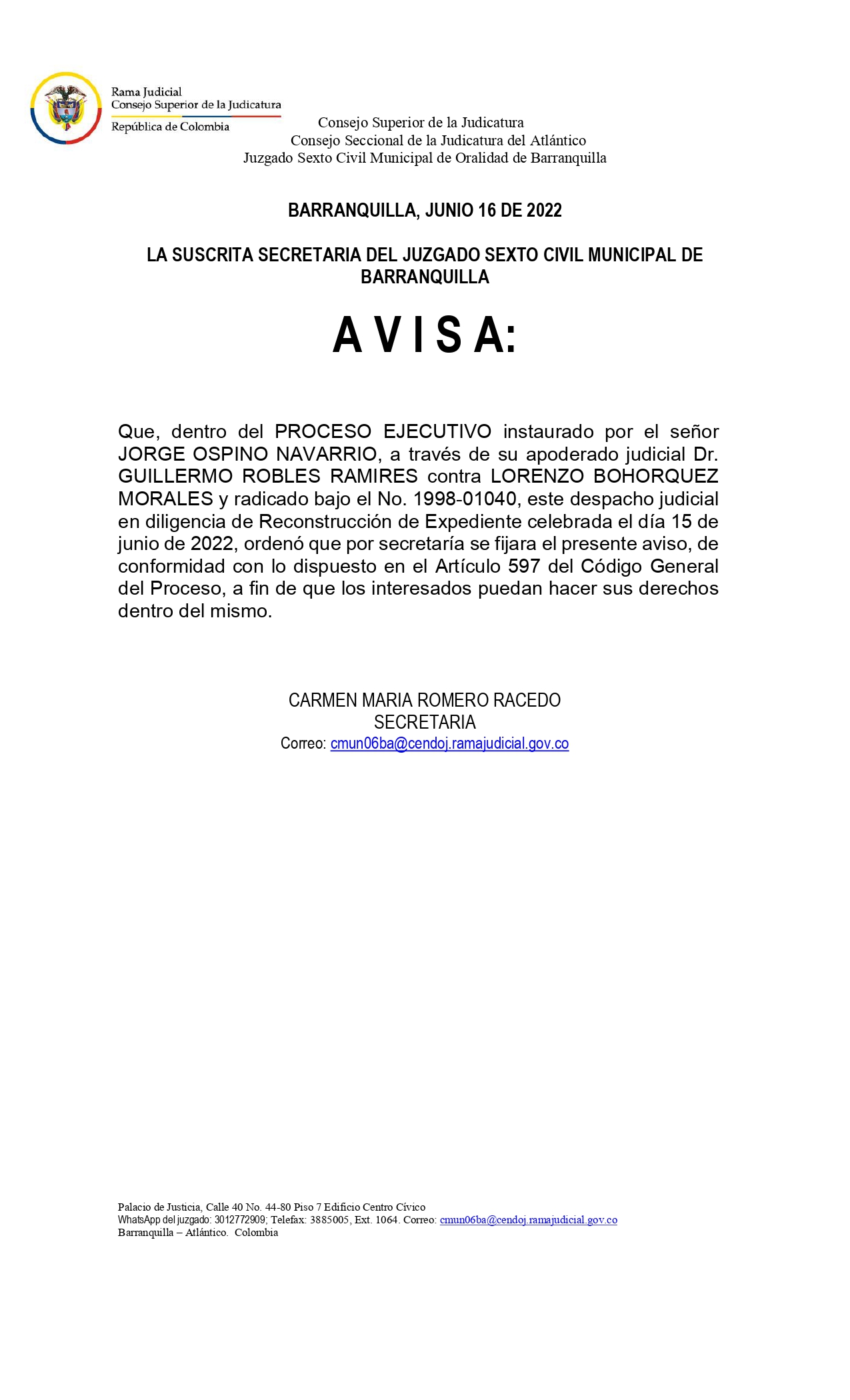 LA SUSCRITA SECRETARIA DEL JUZGADO SEXTO CIVIL MUNICIPAL DE BARRANQUILLA