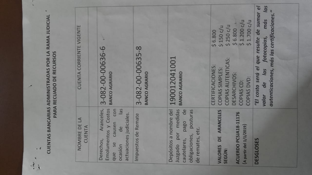 De conformidad a la suspensión de términos y sus excepciones contenidos en los Acuerdos PCSJA20-11517, PCSJA20-11518, PCSJA20-11519, PCSJA20-11521, PCSJA20-11526, PCSJA20-11527, PCSJA20-11528, PCSJA20-11529, PCSJA20-11532, PCSJA20-11546, PCSJA20-11549, PCSJA20 – 11556 del Consejo Superior de la Judicatura, este Despacho informa que para el pago de derechos, aranceles, emolumentos, costos, remates, posturas, medidas cautelares, que se causen con ocasión de las actuaciones judiciales, se hacen públicas las cuentas bancarias para su oportuno recaudo.