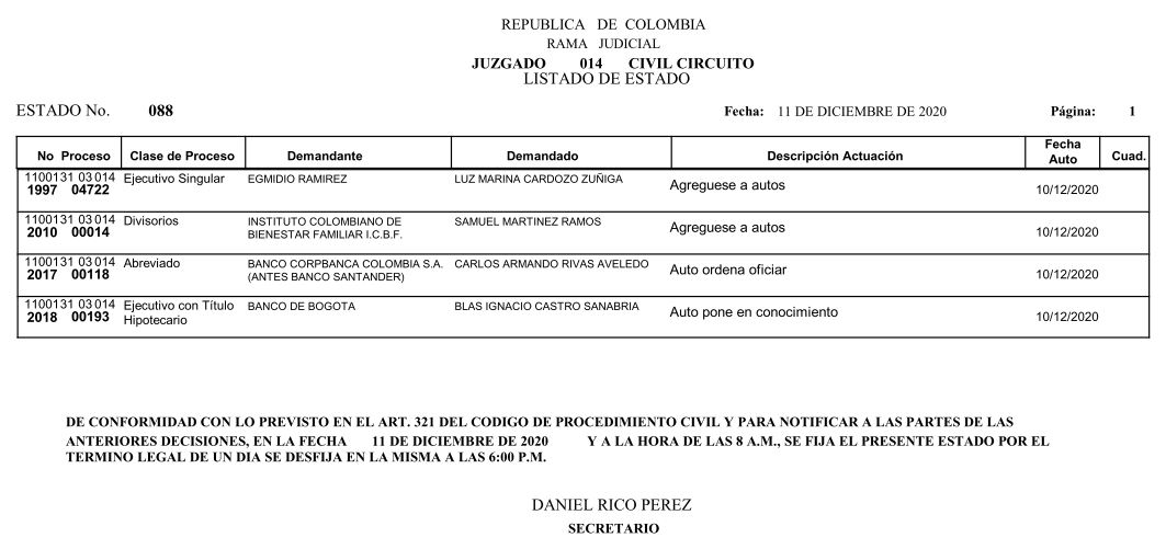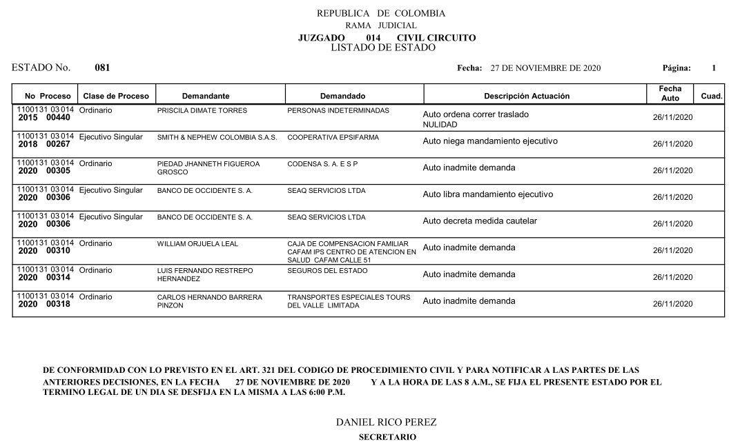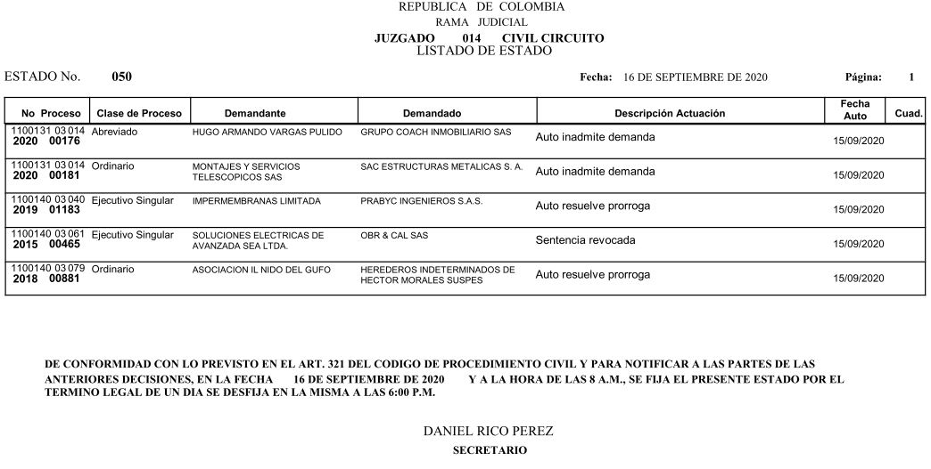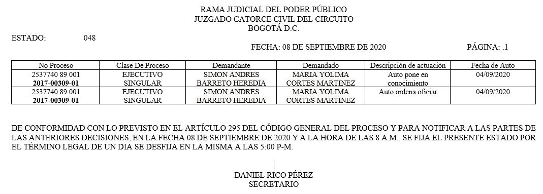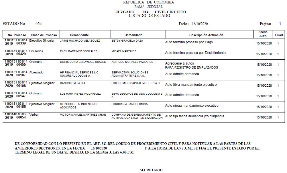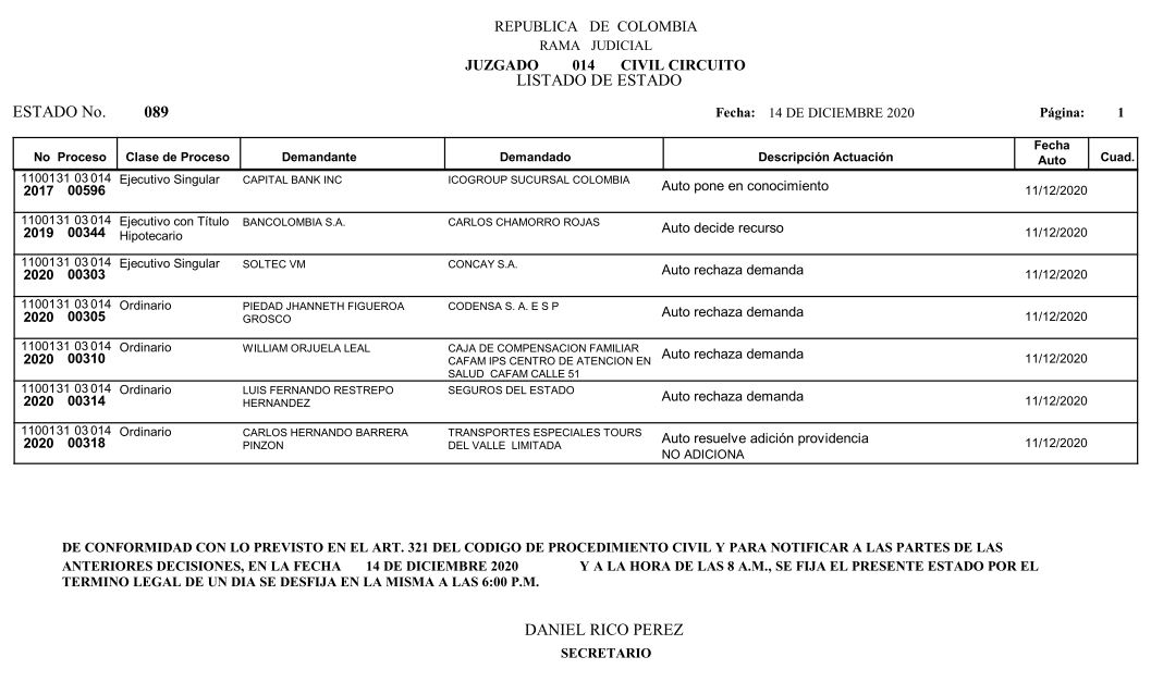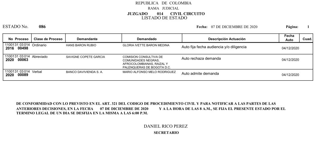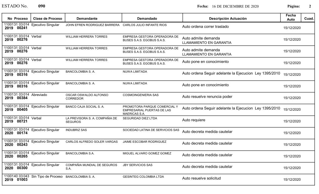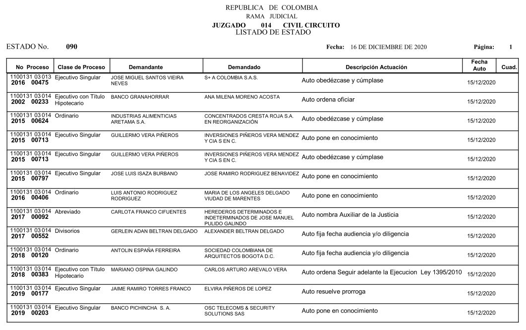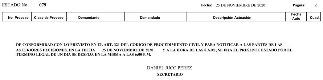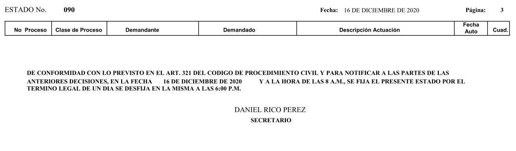 Se comunica a los señores abogados y público en general, que debido a inconvenientes en el sistema, el estado No. 090 de fecha 16 de diciembre de 2020, se correrán términos a partir del 18 de diciembre del 2020 a las 8 a m.