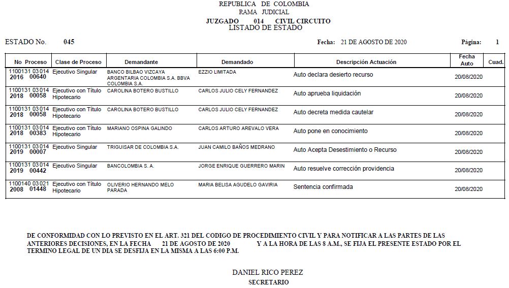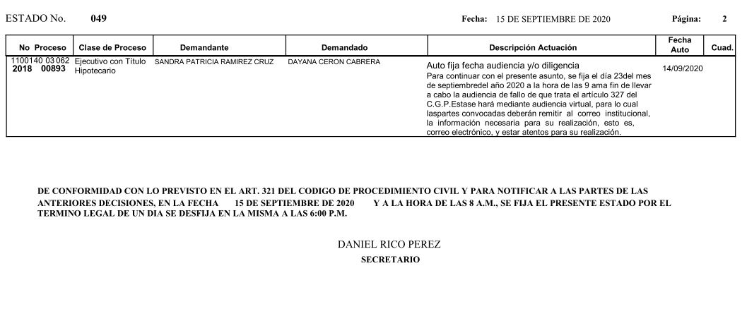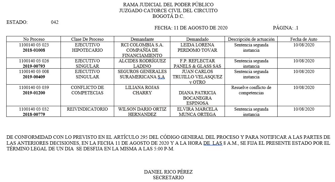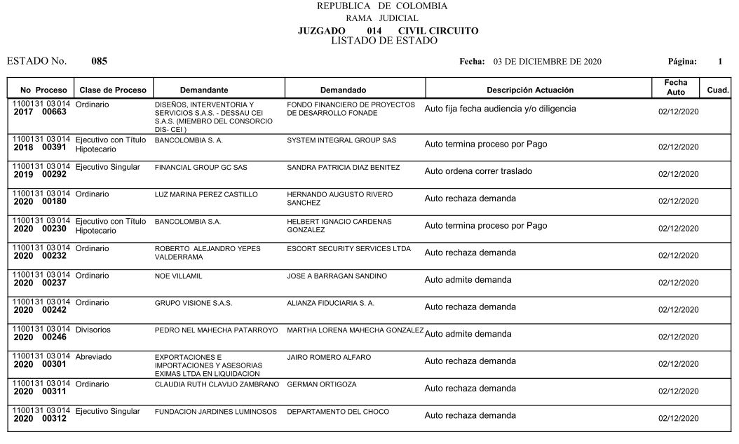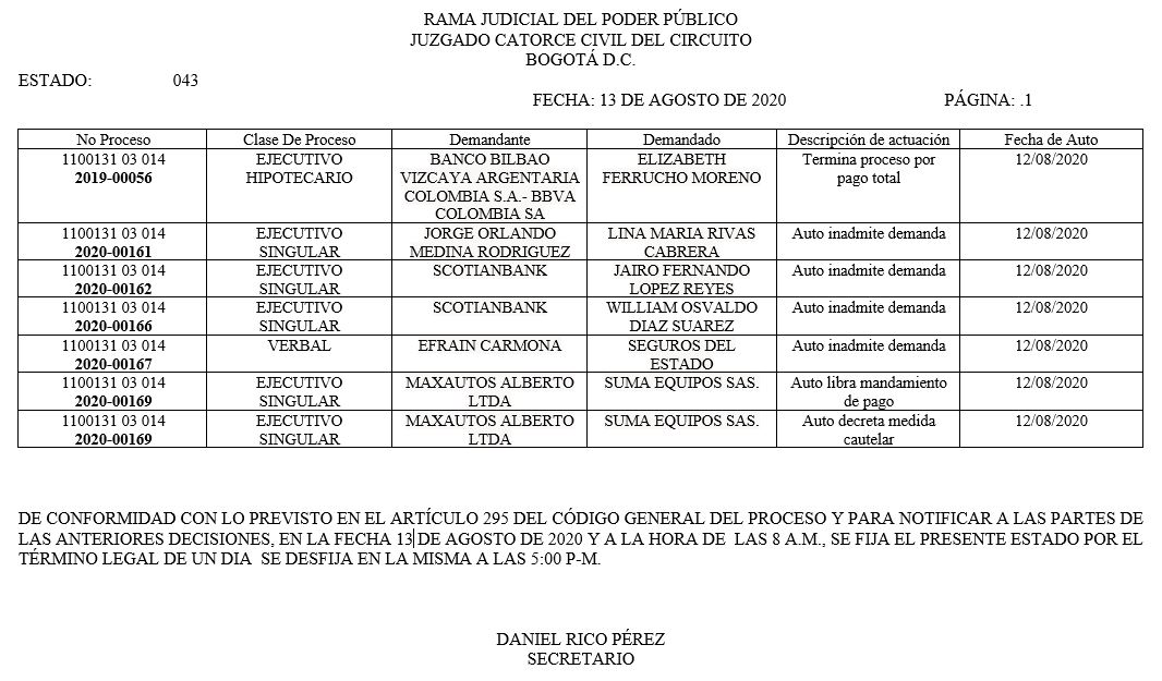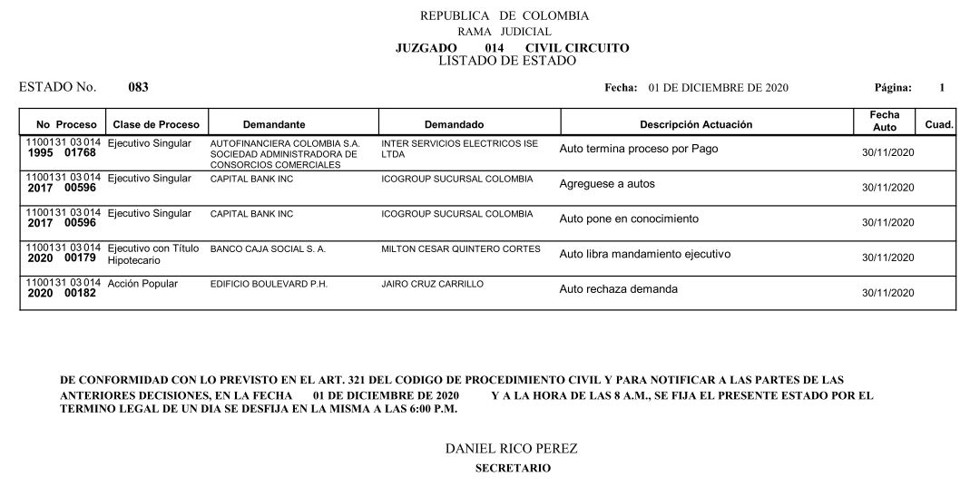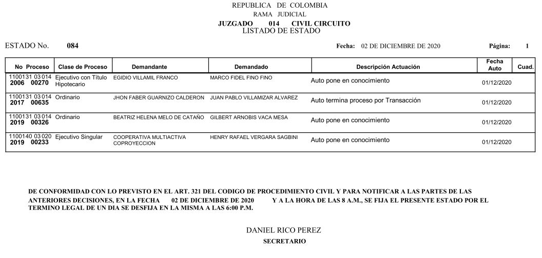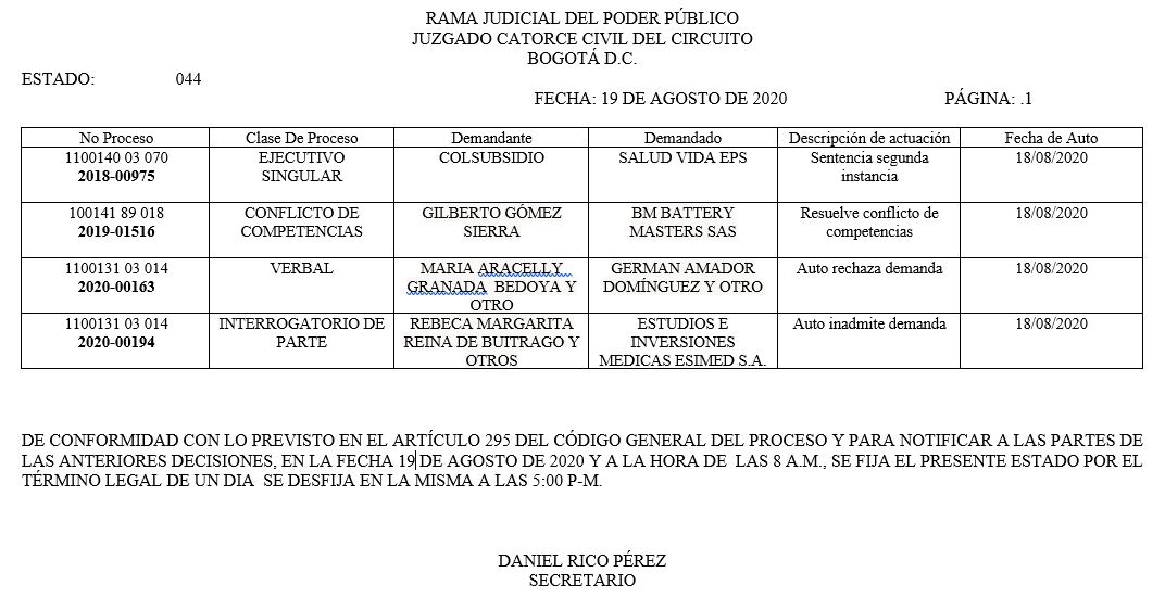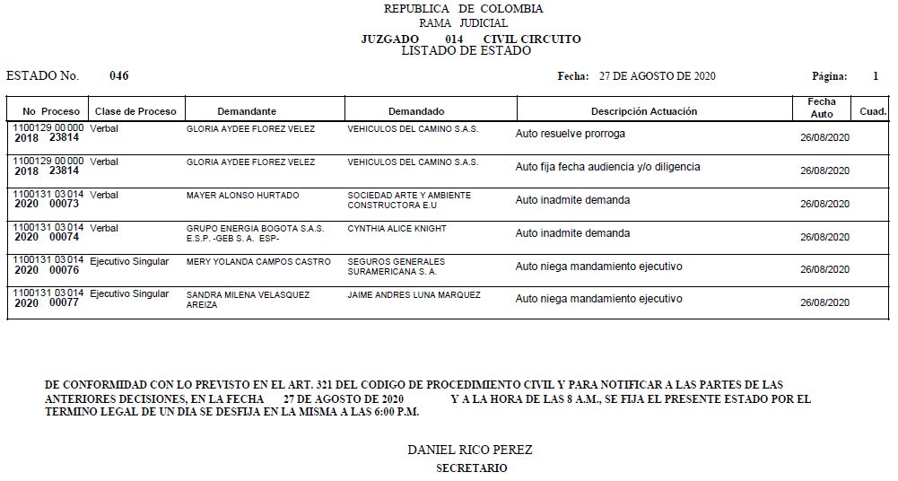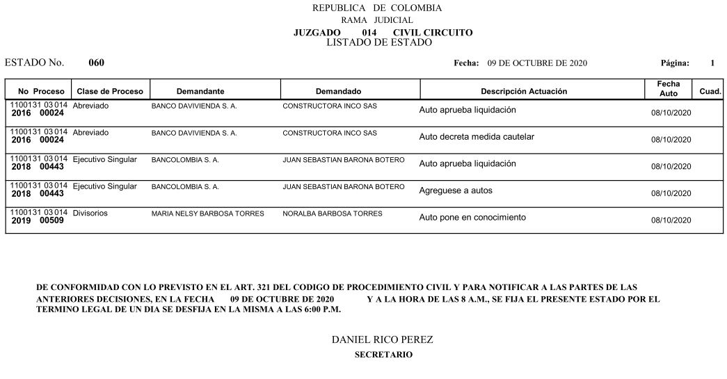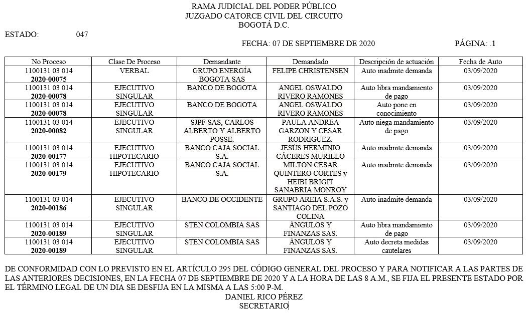 Se comunica a los señores abogados y público en general, que debido a inconvenientes en el sistema, el estado No. 090 de fecha 16 de diciembre de 2020, se correrán términos a partir del 18 de diciembre del 2020 a las 8 a m.