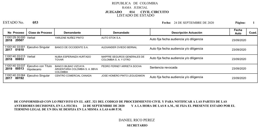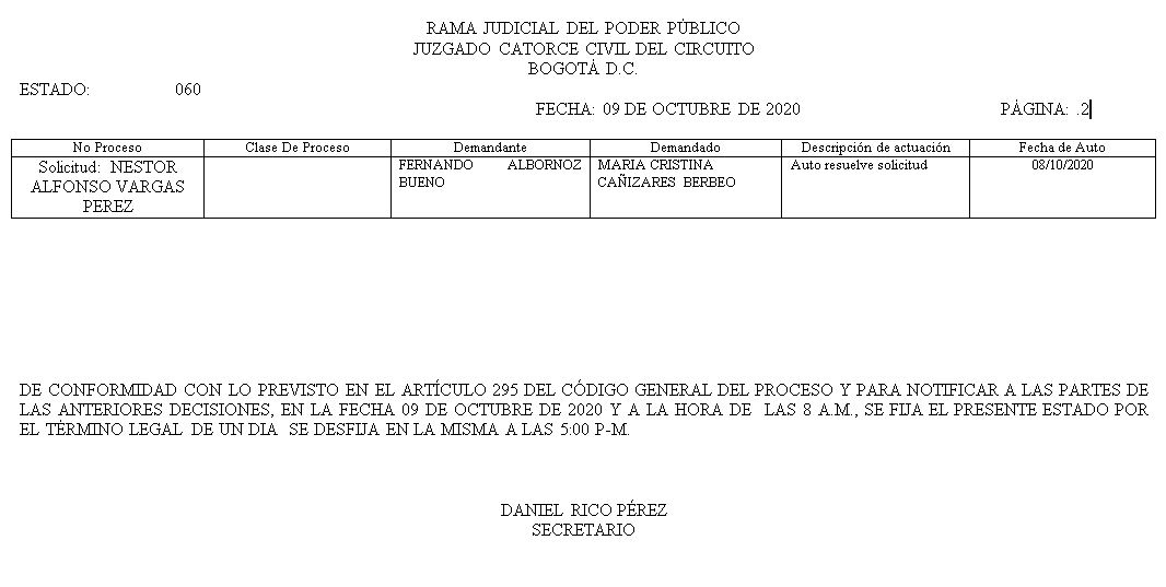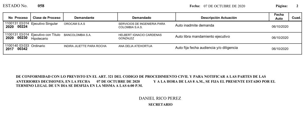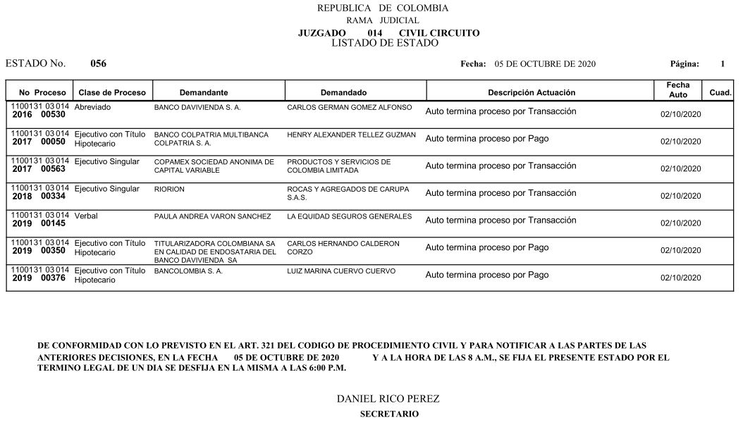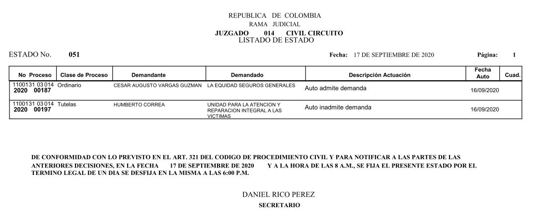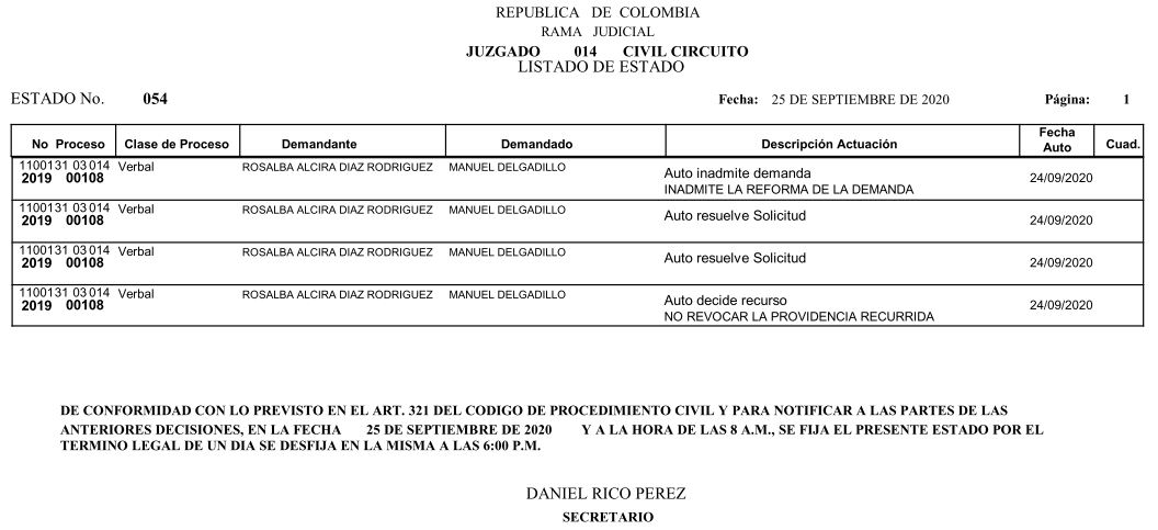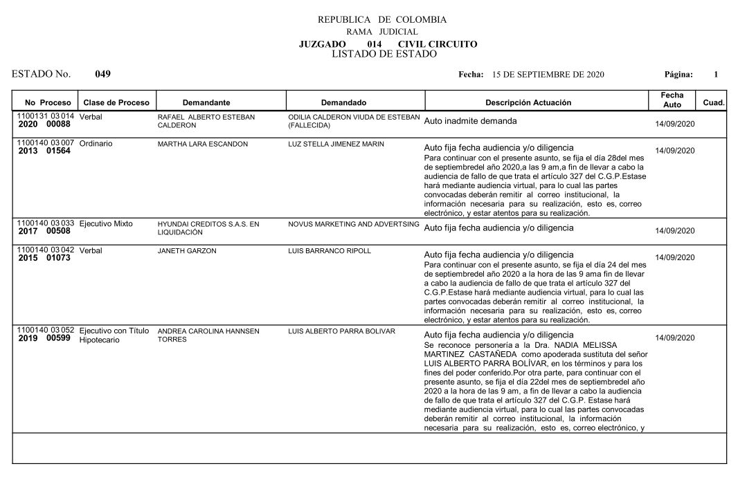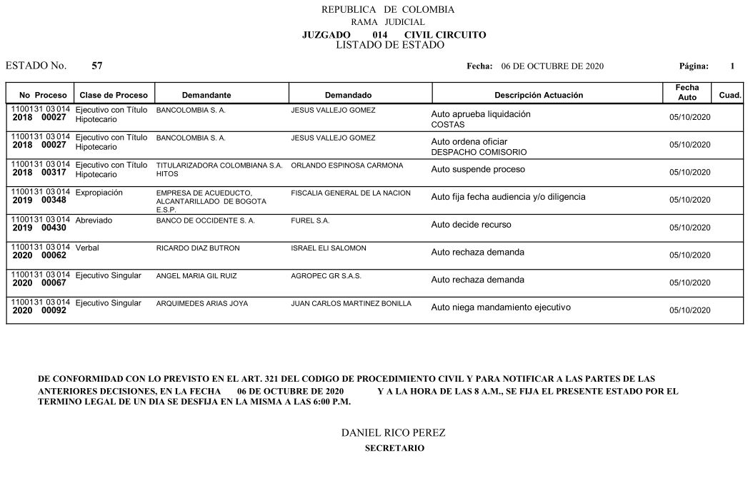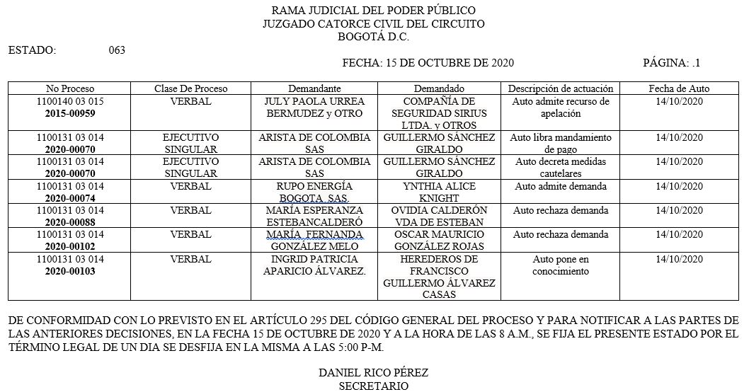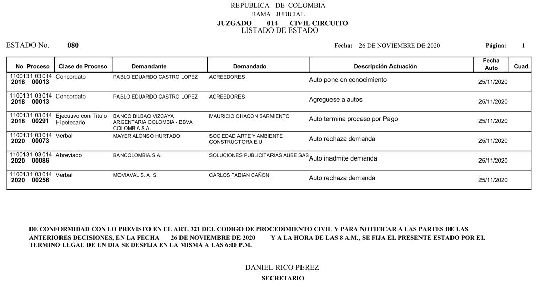 Se comunica a los señores abogados y público en general, que debido a inconvenientes en el sistema, el estado No. 090 de fecha 16 de diciembre de 2020, se correrán términos a partir del 18 de diciembre del 2020 a las 8 a m.