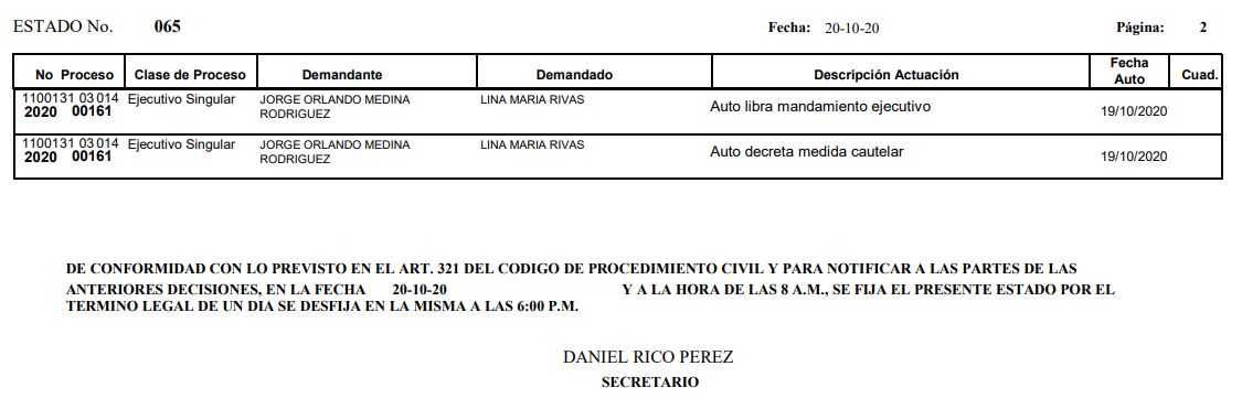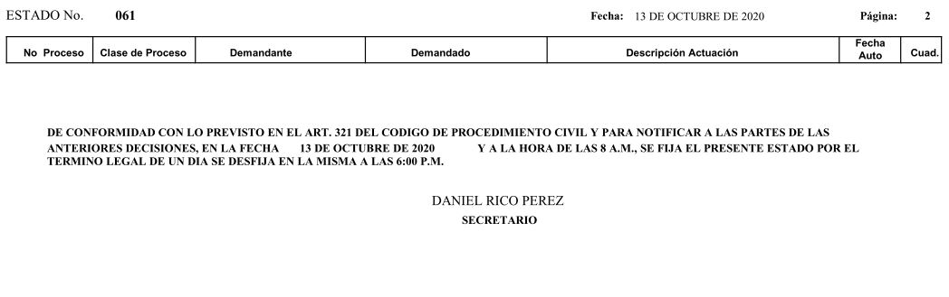 | ESTADO No. | FECHA AUTO | RADICADO | FECHA ESTADO | ARCHIVO |