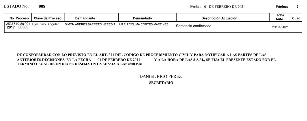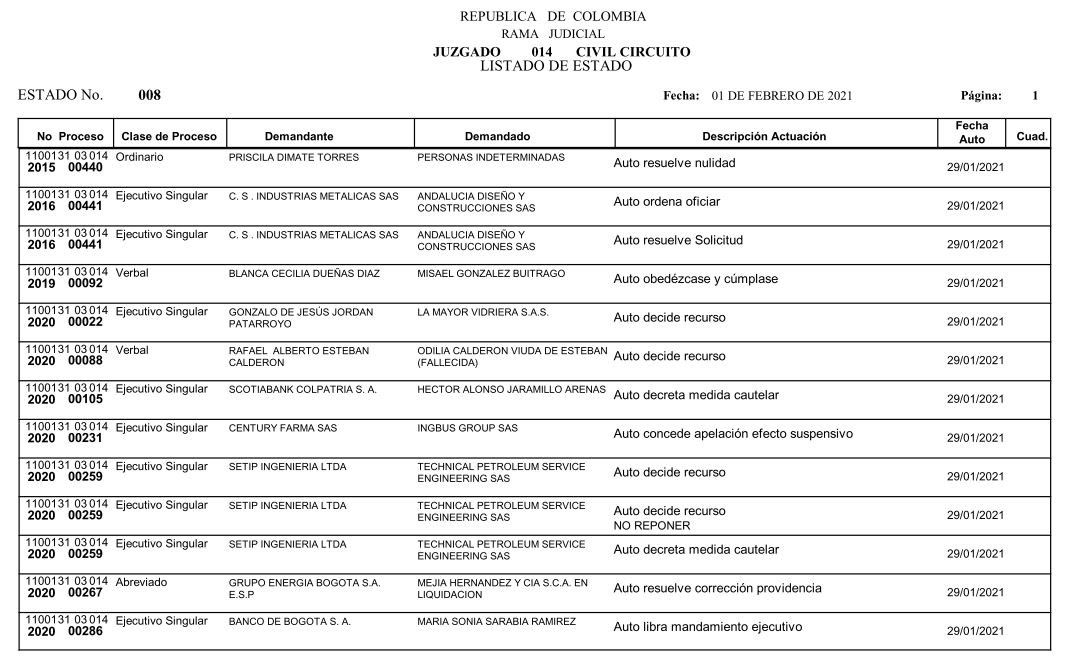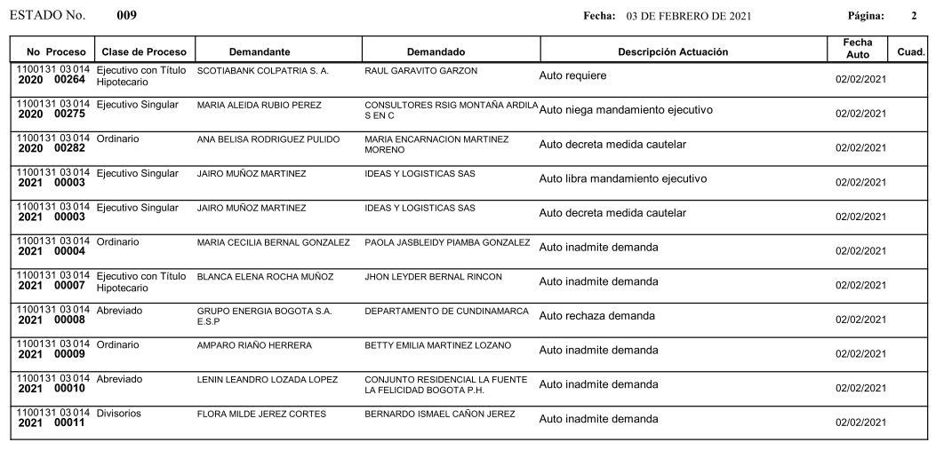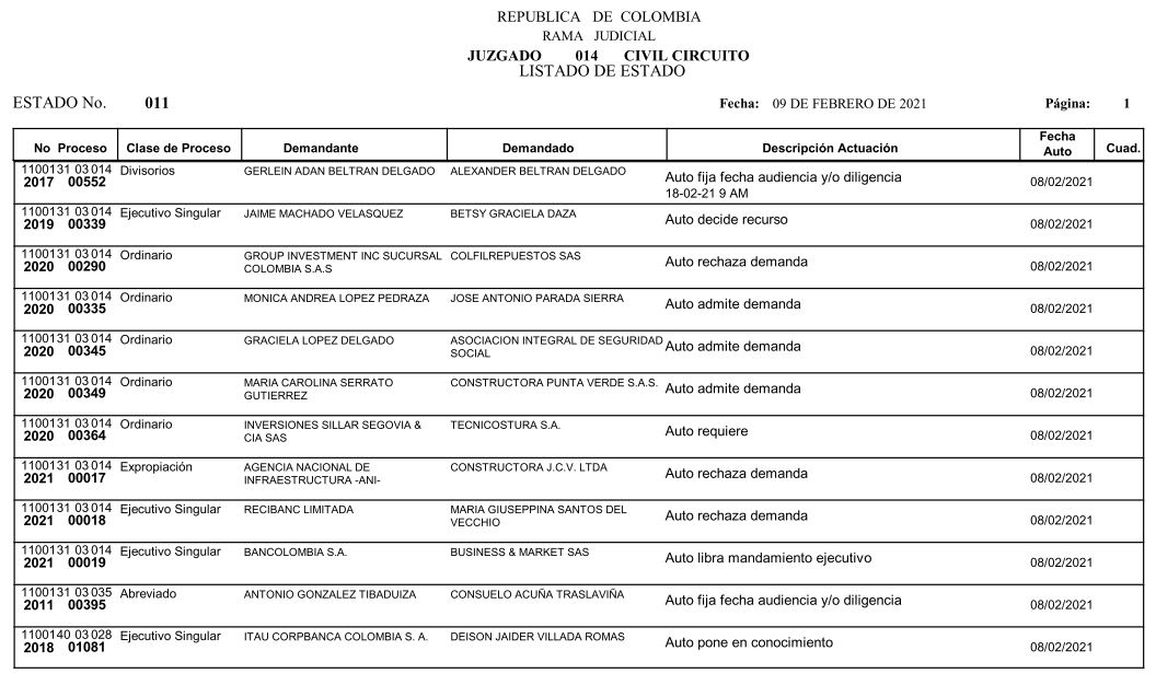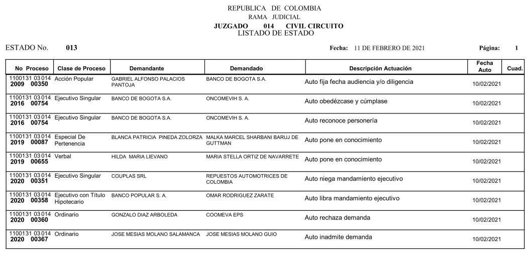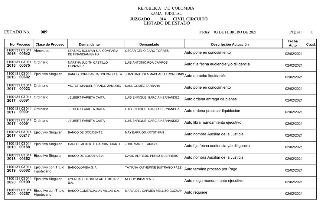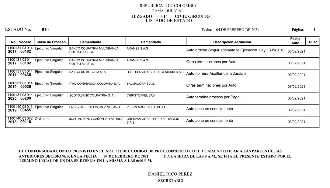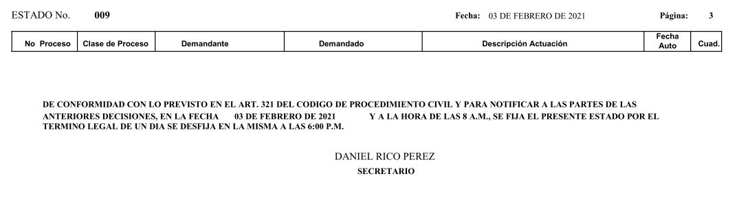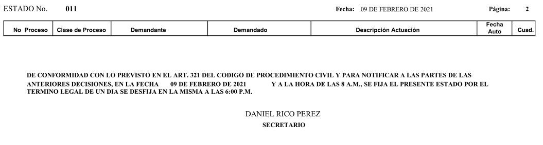 Se comunica a los señores abogados y público en general, que debido a inconvenientes en el sistema, el estado No. 010 de fecha 04 de febrero de 2021, se correrán términos a partir del 05 de febrero de 2021 a las 8 a m.