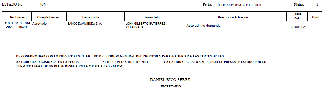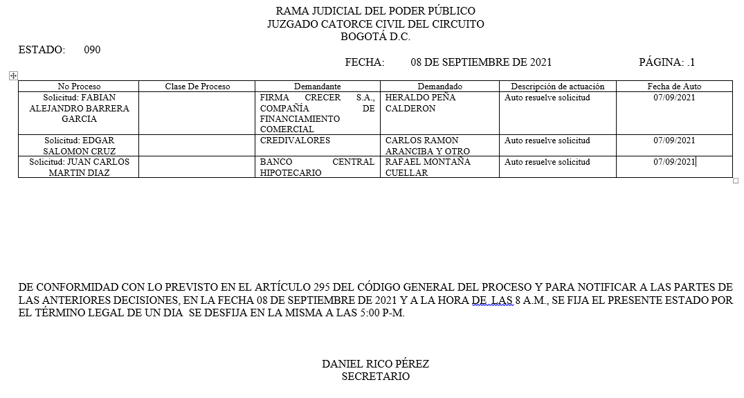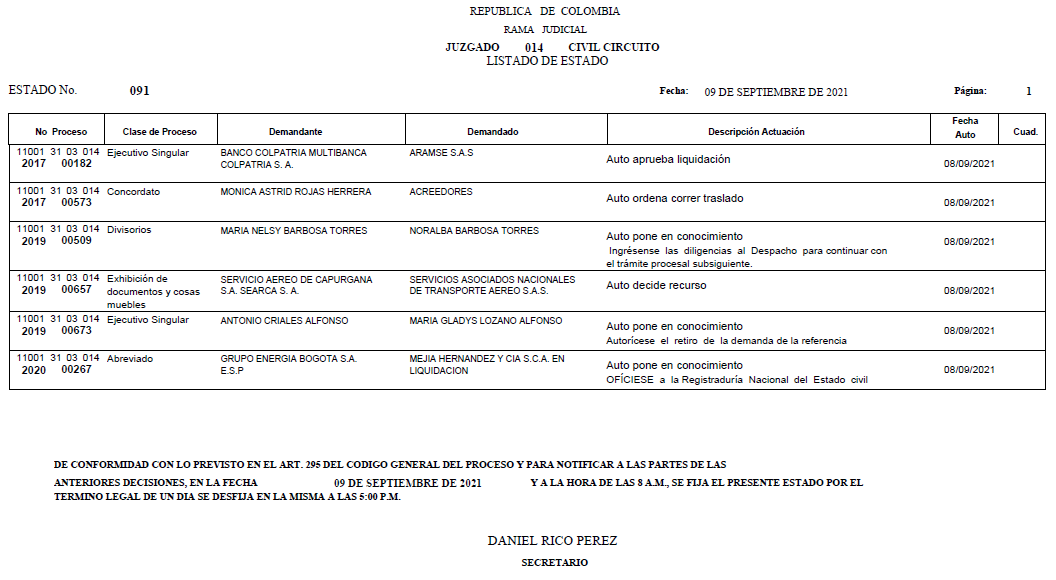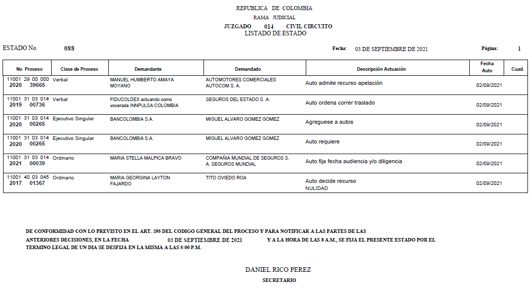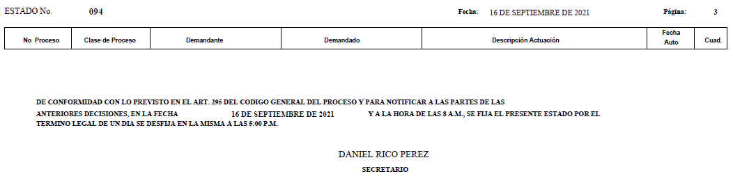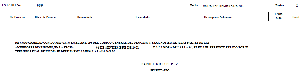 Se comunica a los se�ores abogados y p�blico en general, que debido a inconvenientes con la p�gina web de la Rama Judicial (micrositio), el estado No. 087 de fecha 01 de septiembre de 2021, se correr�n t�rminos a partir del 02 de septiembre de 2021 a las 8 a m.