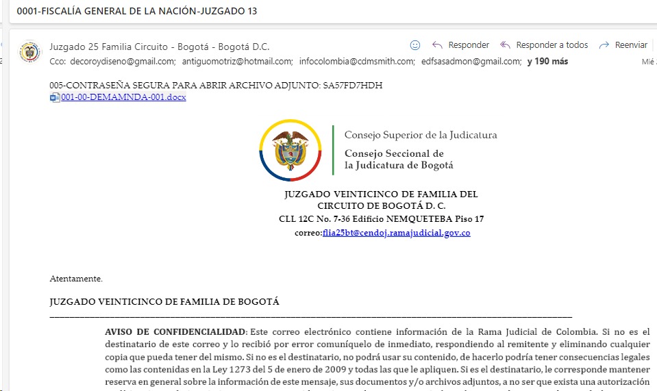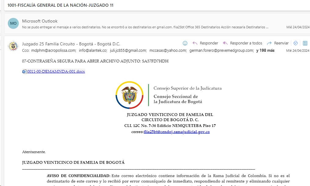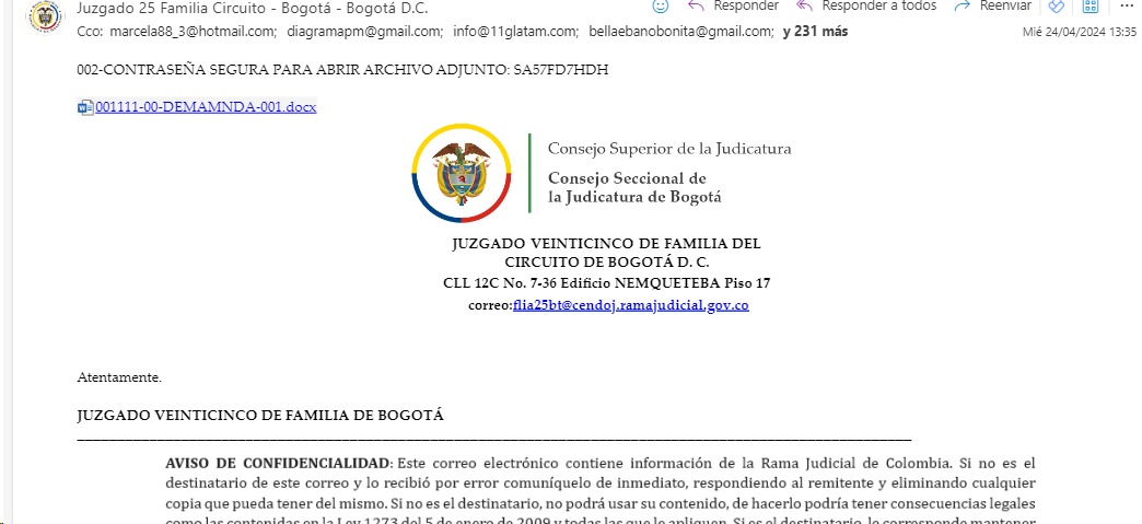 El Juzgado Veinticinco de Familia de Bogotá, informa a los usuarios de la justicia que el día de hoy fue restablecida la cuenta institucional, por parte del Consejo Superior de la Judicatura -Centro de Documentación Judicial CENDOJ-. Para tales efectos, se informa que el incidente ocurrió los días 25 a 29 de abril de 2024, por envíos masivos de mensajes con Malware, por terceros ajenos a esta sede judicial.