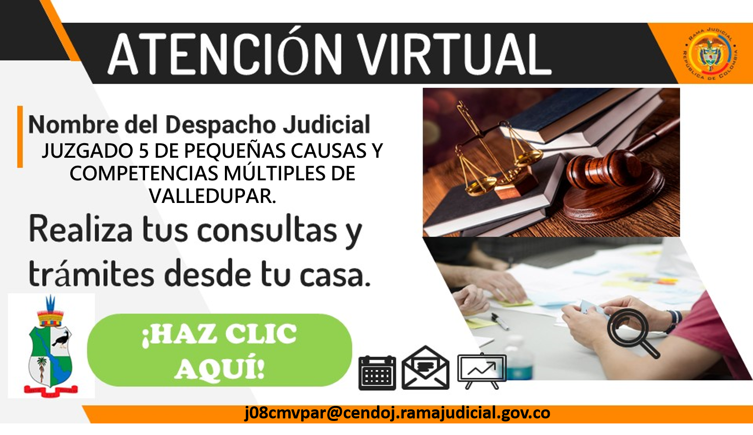 Baranda virtual: j08cmvpar@cendoj.ramajudicial.gov.co (Desarchivo, desgloses, retiro de demandas, enlaces de procesos electrónicos, citas presenciales y virtuales, oficios expedidos antes de marzo de 2020, relación de depósitos judiciales etc.)