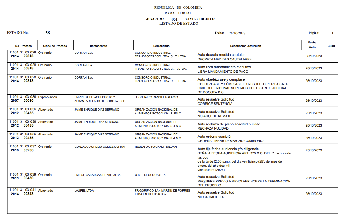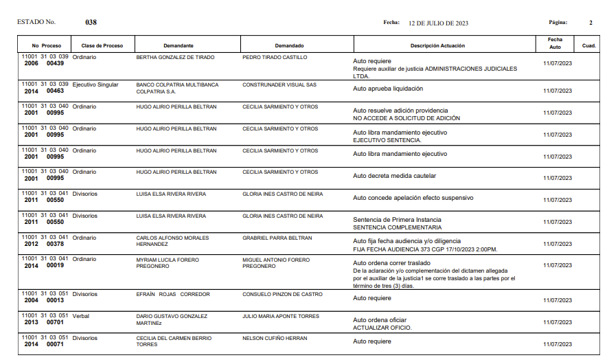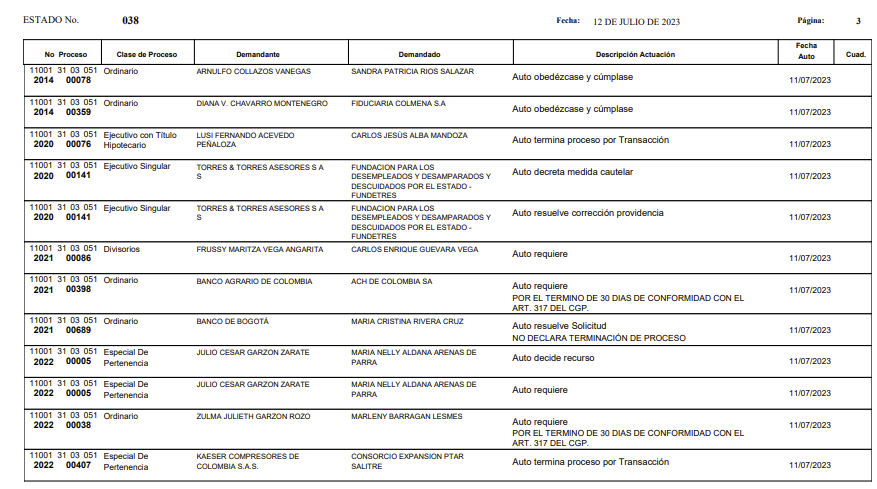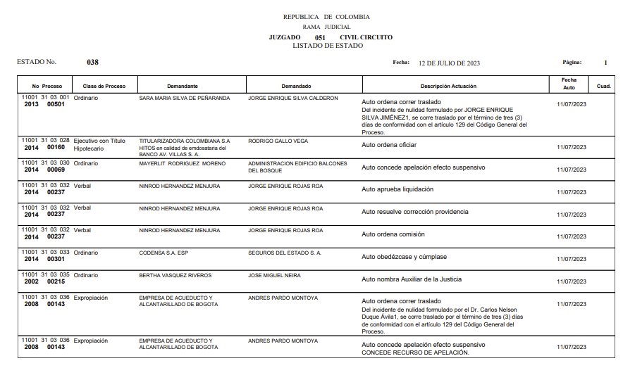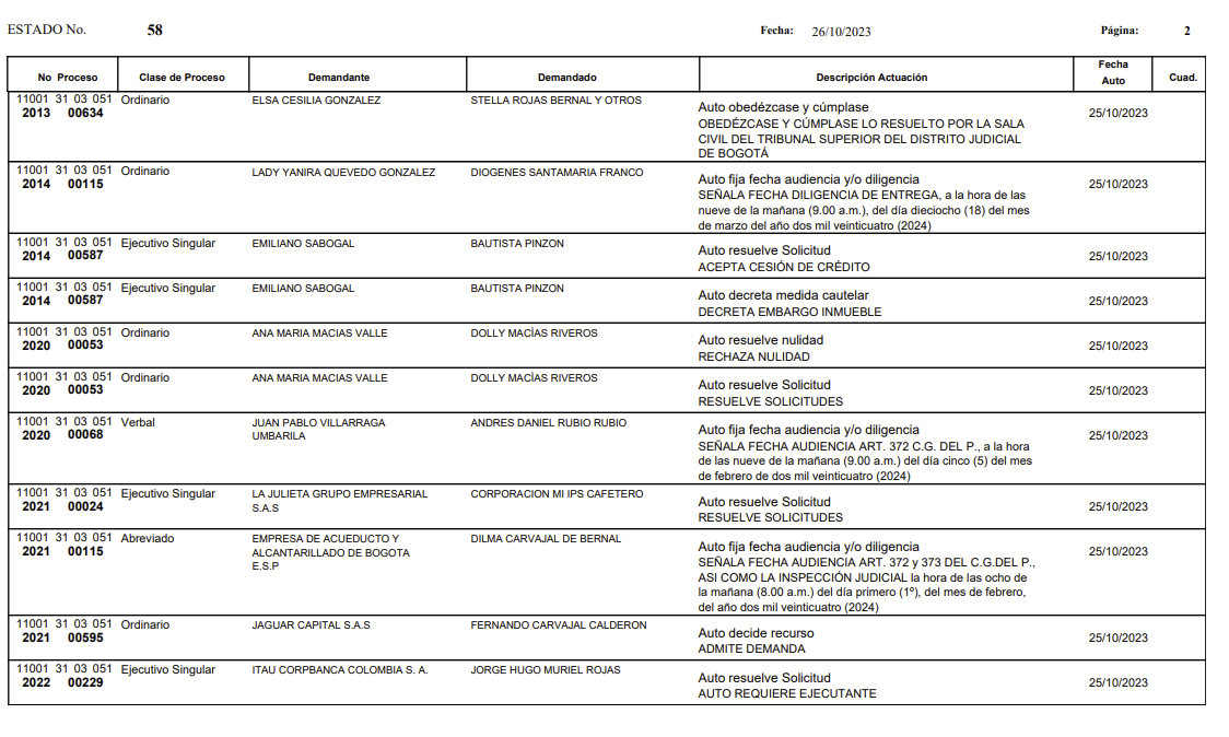 | 32 | 110013103051 2021 00243 00 | Juzgado 51 Civil Circuito | EJECUTIVO EFECTIVIDAD GARANTIA REAL | SCOTIABANK COLPATRIA S.A. | ELSIDA INES CARDENAS FORERO | 26-ene-23 |