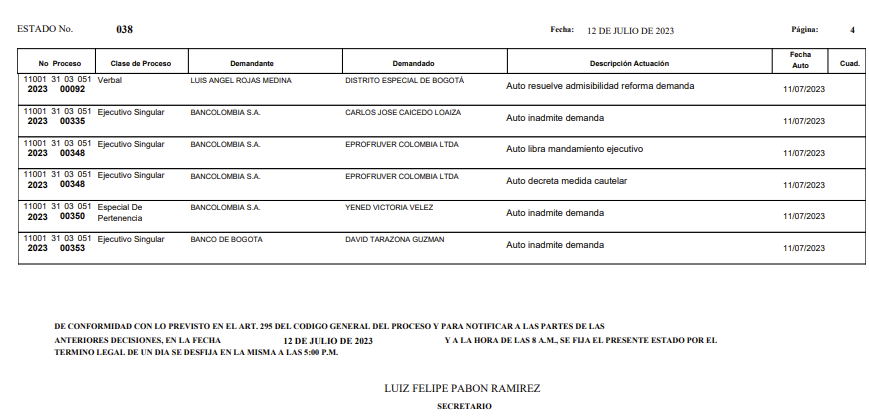| 4 | 110013103051 2022 00590 00 | Juzgado 51 Civil Circuito | DECLARATIVO - SIMULACION | LUIS HUMBERTO RICO HERNANDEZ | ONALFA MARTINEZ | 26-ene-23 |