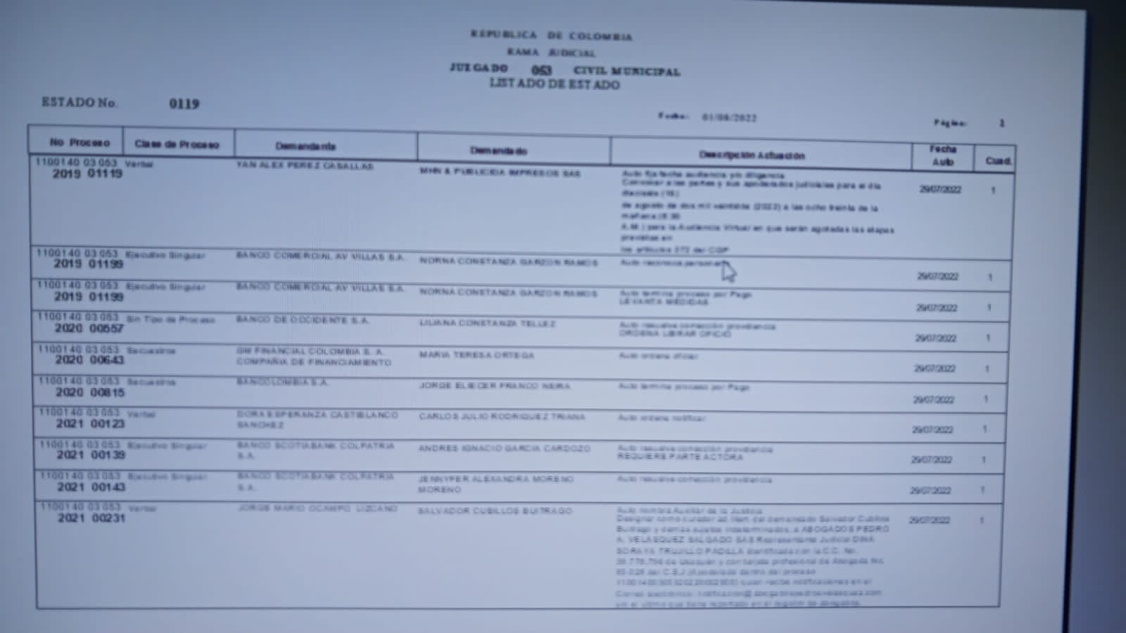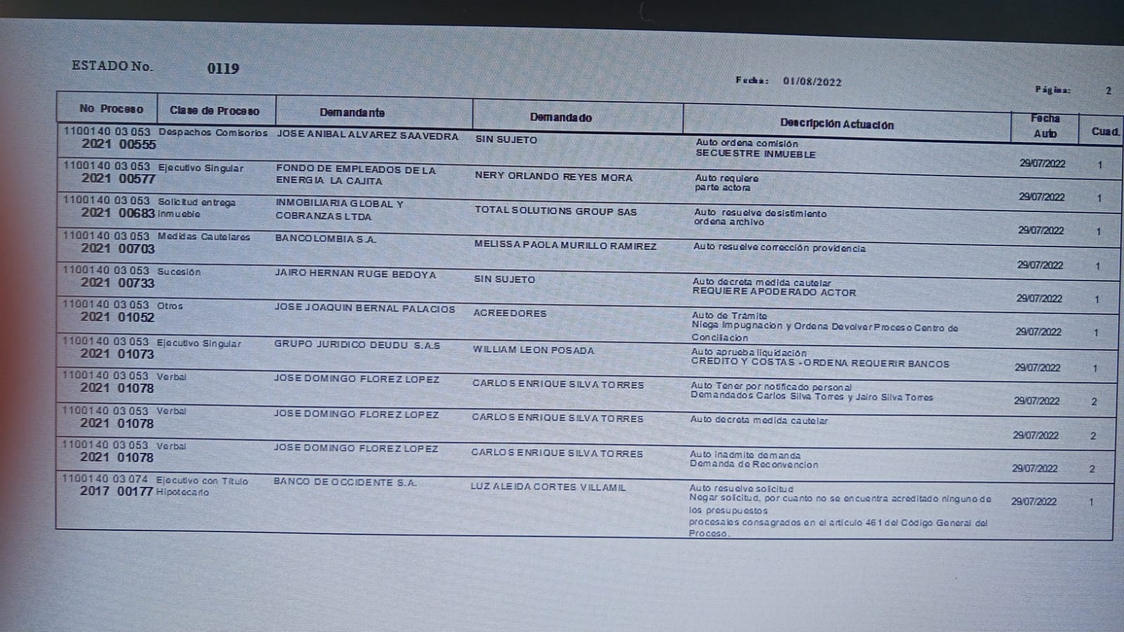 | 1° DE AGOSTO DE 2022 | ABRA EL ESTADO Y EN EL NUMERO DE CADA PROCESO HAGA CLIK DONDE VISUALIZARA EL AUTO CORRESPONDIENTE. 53202101078 |