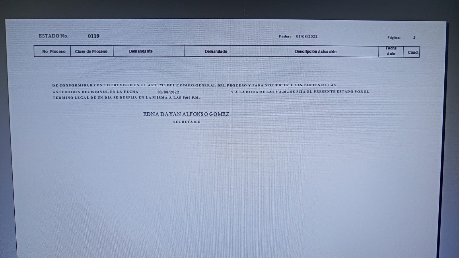 | STADO NUMERO | FECHA ESTADO | AUTOS |