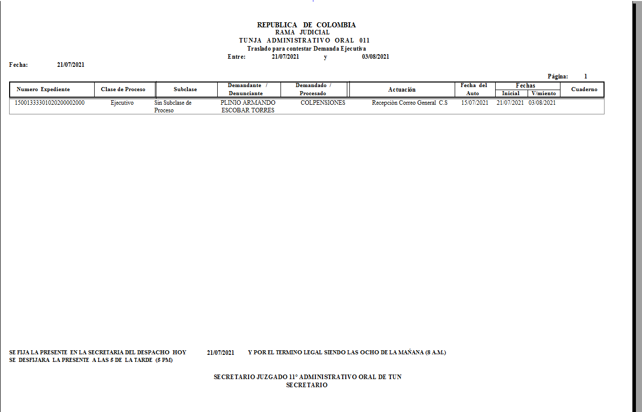 | - TRASLADO PARA CONTESTAR DEMANDA EJECUTIVA NO. 150013333011 2020 00055 00 | 13/08/2021 | 1/10/2021 | |