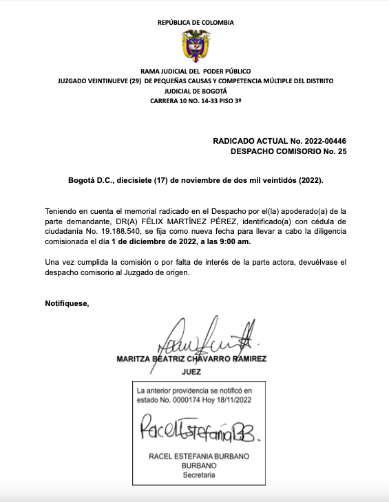| 1 de diciembre de 2022 | 0000182 | Auto reprograma 2022-00446 |
