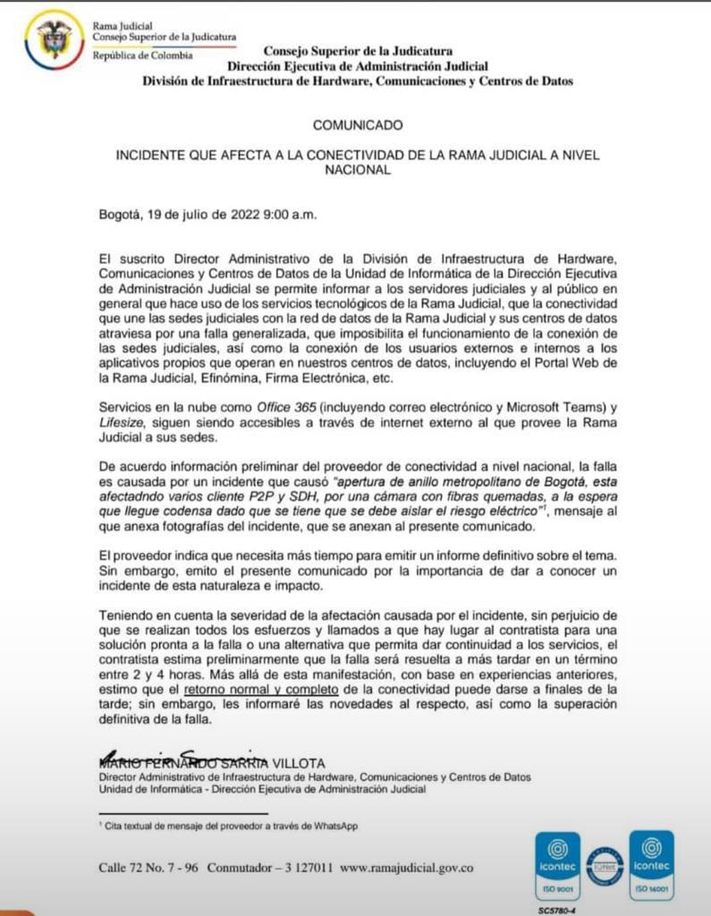 CONSTANCIA SECRETARIAL 19 JULIO DE 2022: Se deja constancia que los traslados de la fecha en mencion no fueron publicados a las 08.00am debido a fallas en el servicio de internet. COMUNICADOS FALLA EN EL SERVICIO 19/07/2022