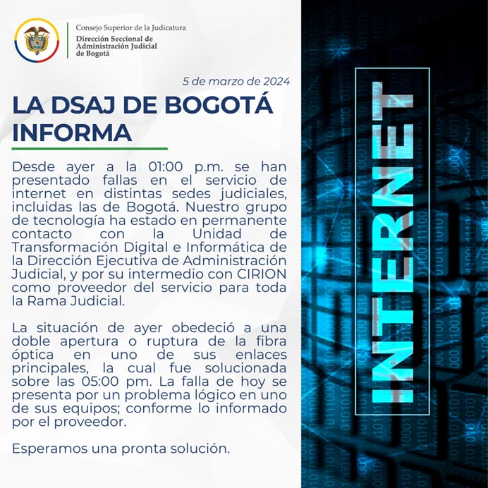 06/03/2024 Se informa que por los problemas presentados en la conexión de internet en las instalaciones del edificio Nemqueteba los días 4 y 5 de marzo de 2024, que impidieron el normal funcionamiento de las plataformas de Office 365 y el Registro de Actuaciones en el Sistema de Justicia XXI, la publicación de estados para el día 6 de marzo de 2024, se efecturá solamente sobre providencias  de Acciones Constitucionales. Agradecemos su comprensión. ATT Fredy Alexander Quiroga Caicedo- Secretario Ver