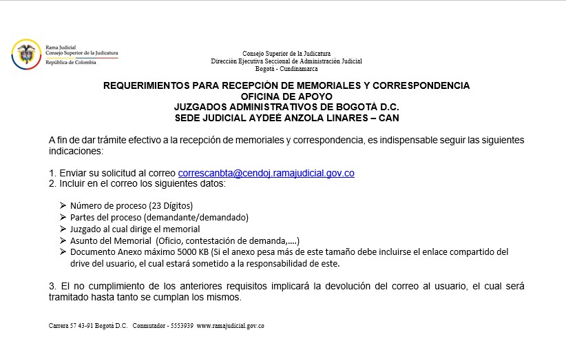 ATENCIÓN AL PÚBLICO: De conformidad con lo estipulado en Decreto Legislativo 806 de 2020, Acuerdo No. PCSJA20-11567 del Consejo Superior de la Judicatura y el Acuerdo No. CSJBTA20- 60 del Consejo Seccional de la Judicatura, a partir del 1 de julio de 2020, se realizará de manera virtual, solamente en casos excepcionales se atenderá de manera presencial en las instalaciones de la sede judicial CAN, mediante asignación de cita, previo diligenciamiento del formulario en el siguiente link: jadmin45bt@cendoj.ramajudicial.gov.co