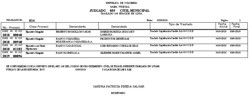 Traslado Nro 014. Junio 03 de 2020 Ver Archivo