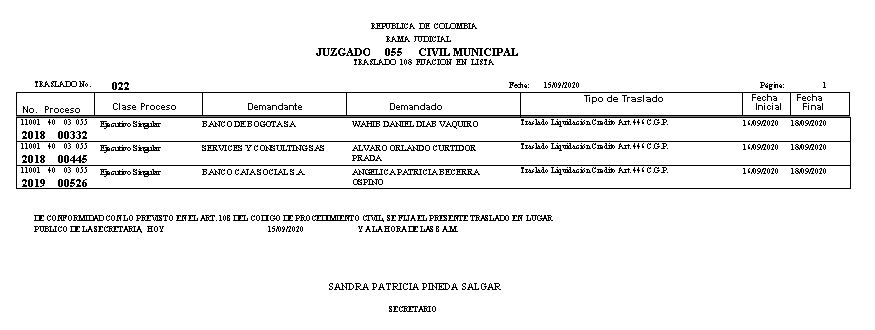 Traslado Nro. 022. Septiembre 15 de 2020 Ver Archivo