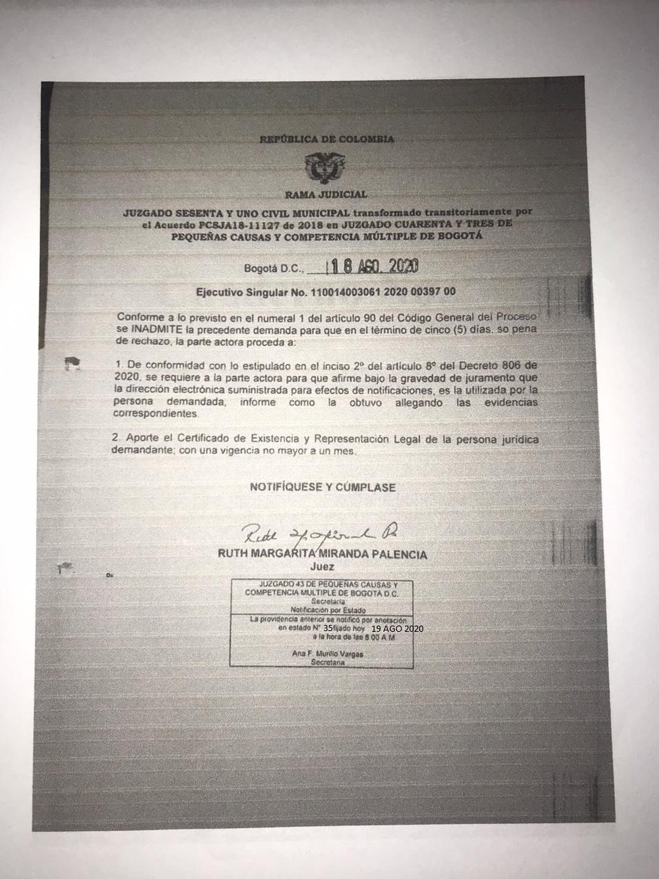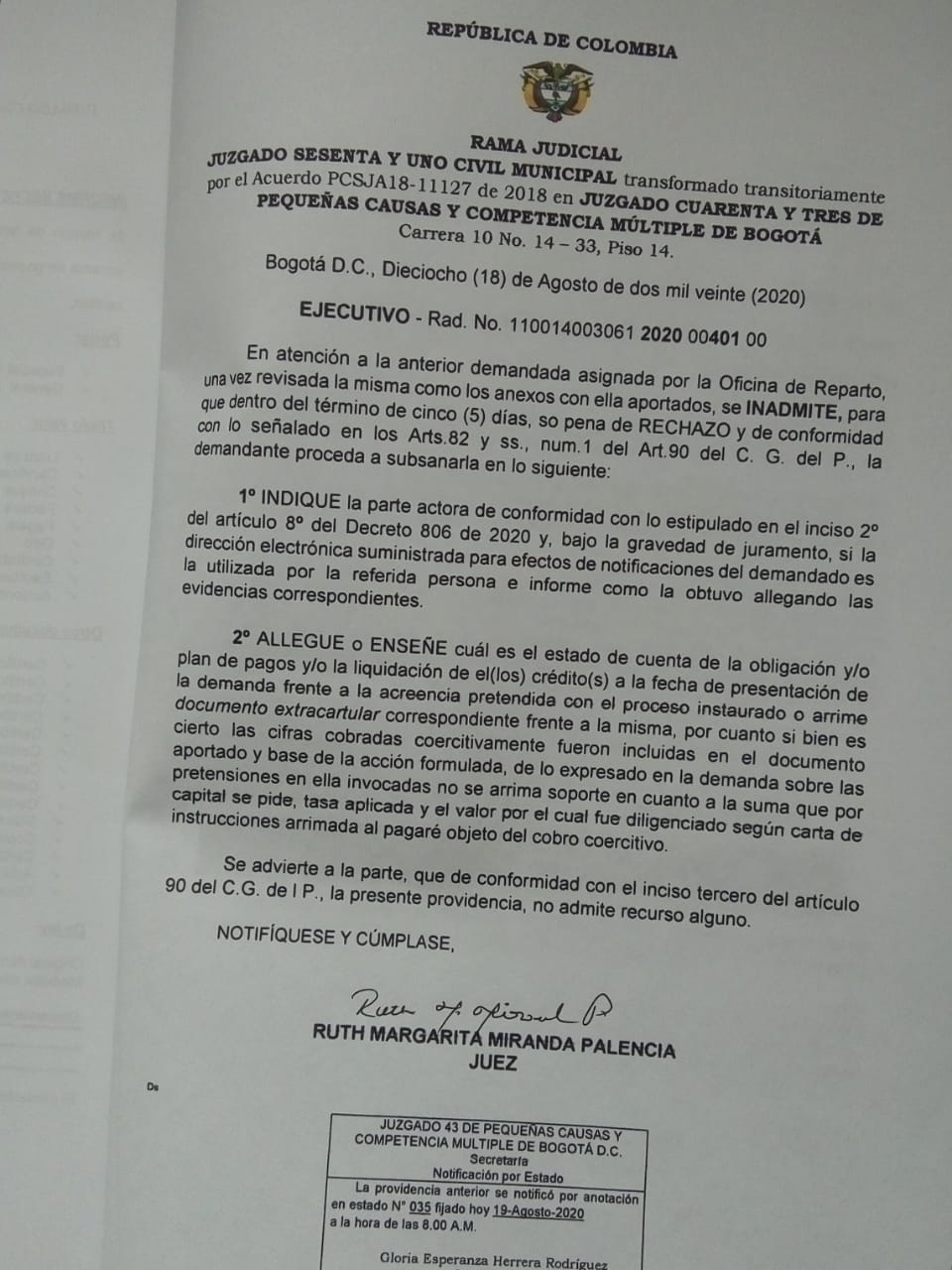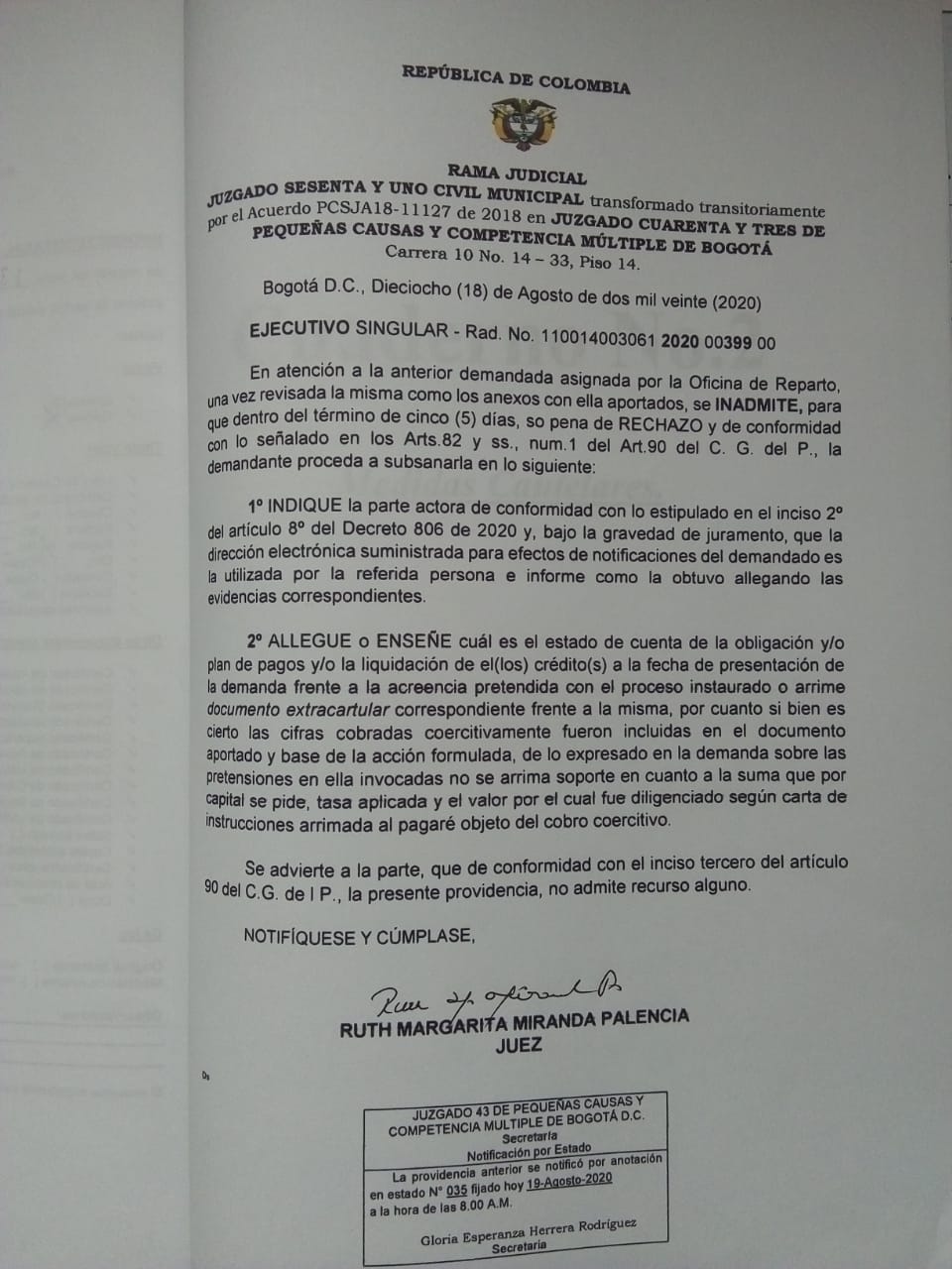 JUZGADO SESENTA Y UNO CIVIL MUNICIPAL DE BOGOTÁ