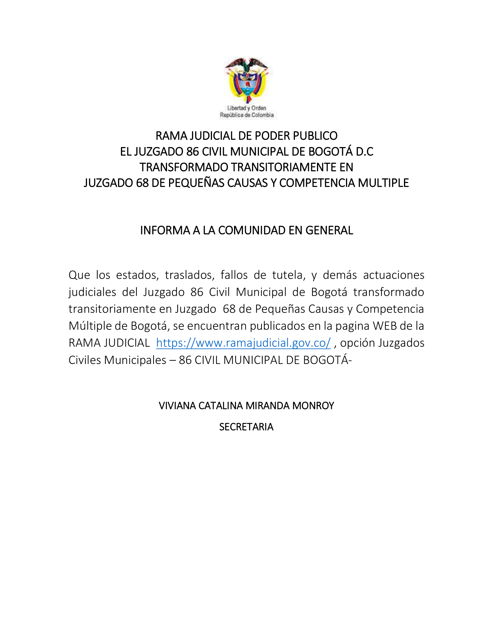 JUZGADO 068 DE PEQUEÑAS CAUSAS Y COMPETENCIA MÚLTIPLE DE BOGOTÁ