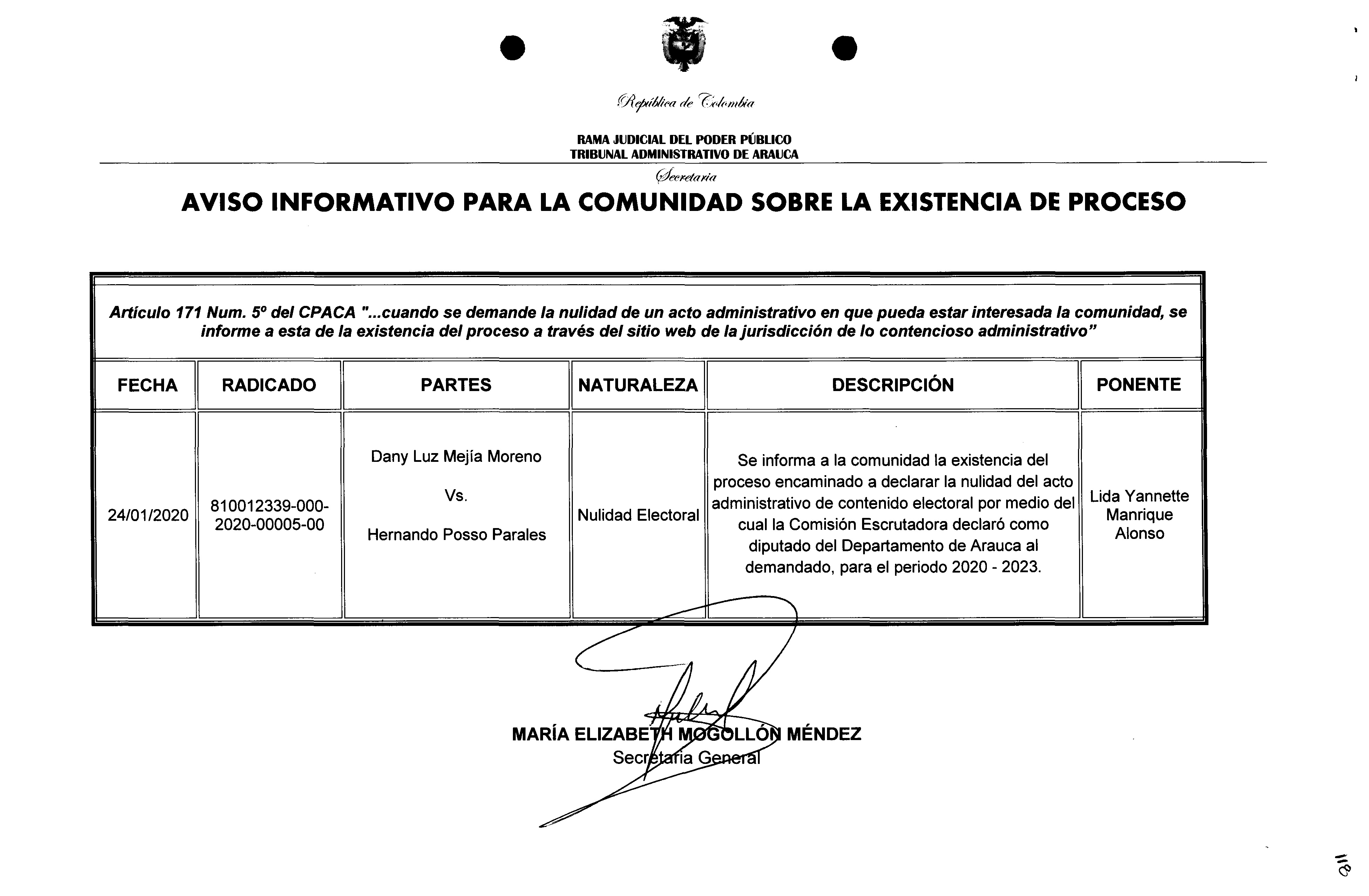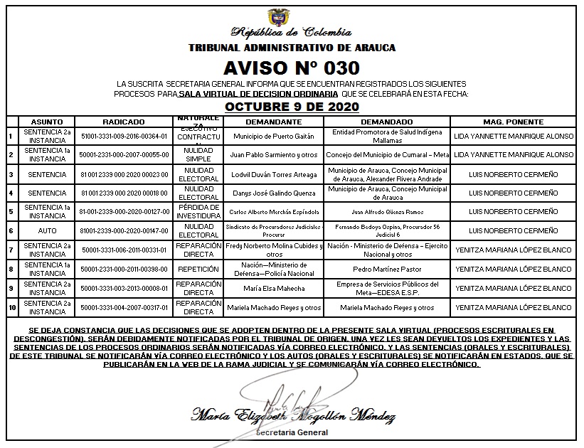 | 03/07/2020 | 81001 2339 000-2020-00029-00 | Asociación Nacional de Empleados de la Defensoría del Pueblo ASEMDEP | NULIDAD ELECTORAL |