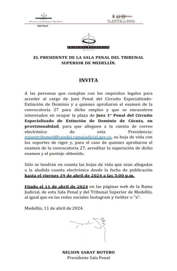EL PRESIDENTE DE LA SALA PENAL DEL TRIBUNAL SUPERIOR DE MEDELLÍN, Invita a las personas que cumplan con los requisitos legales para acceder al cargo de Juez Penal del Circuito...