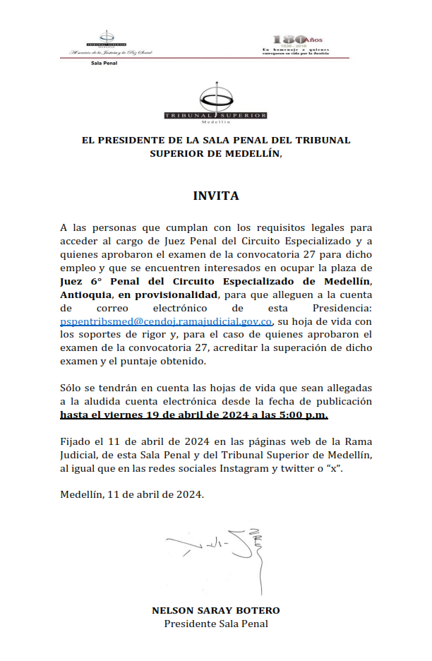 Invitación a ocupar cargo Juez 6° Penal del Circuito Especializado de Medellín, Antioquia, en provisionalidad